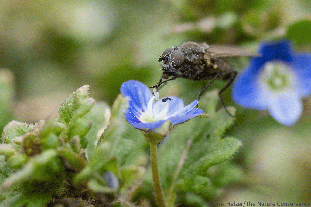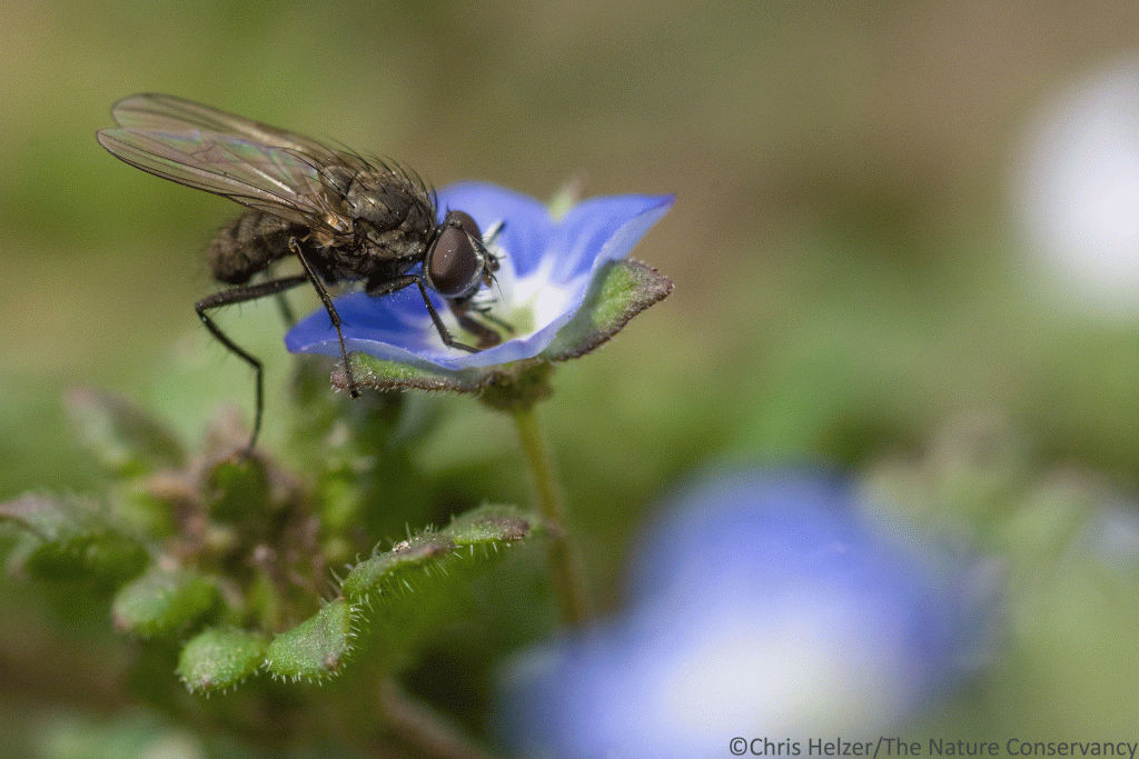A small fly feeds on pollen from gray field speedwell (Veronica polita), one of the first garden ‘weeds’ to bloom each spring. We have some lovely patches in our yard right now.