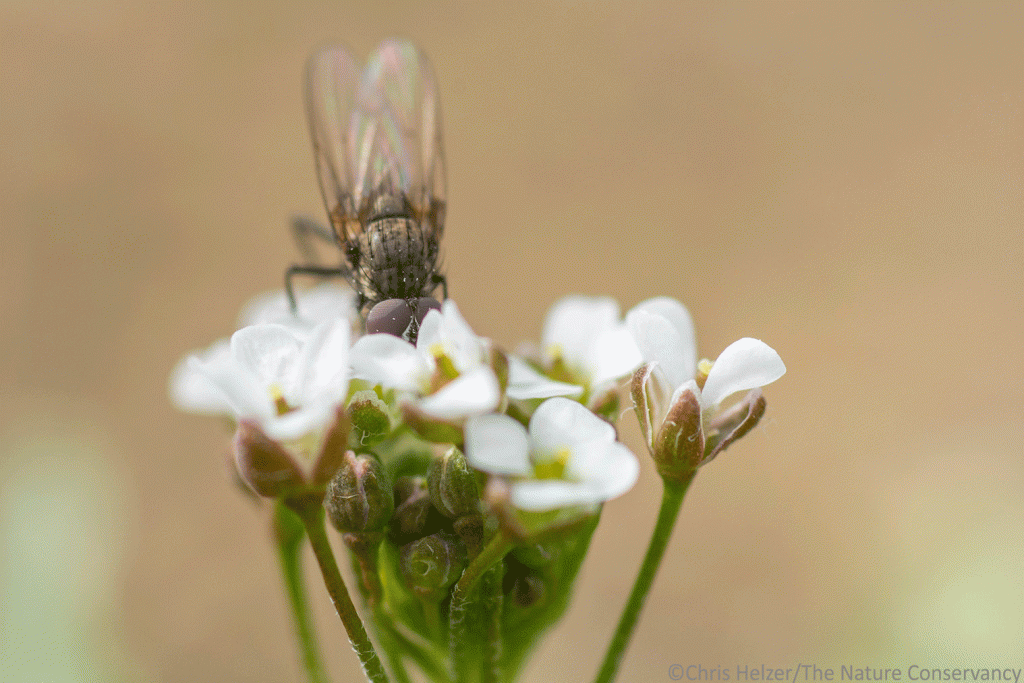 The same kind of small fly shown earlier, but this time feeding on shepherd’s purse (Capsella bursa-pastoris).