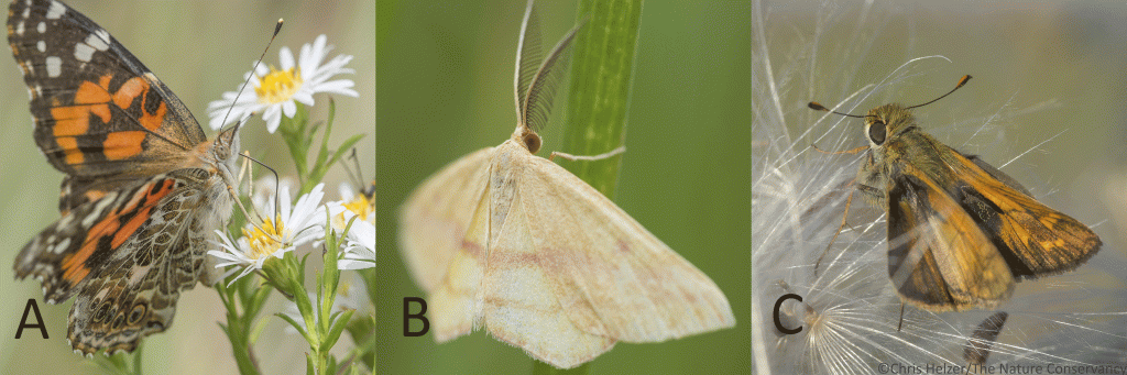 C. A and C are butterflies. B is a moth.