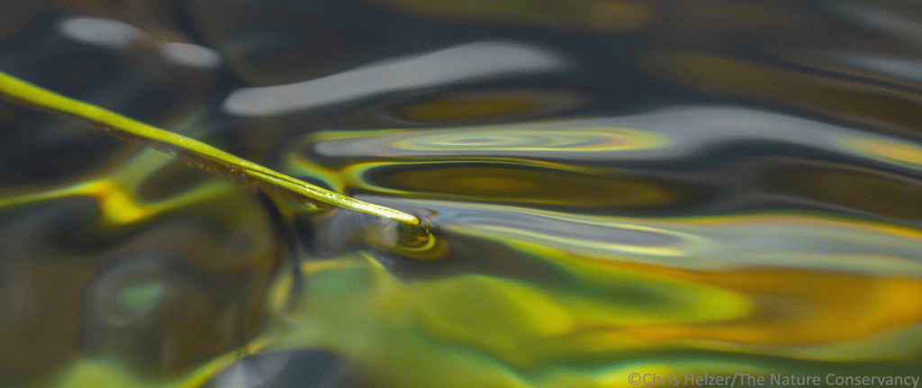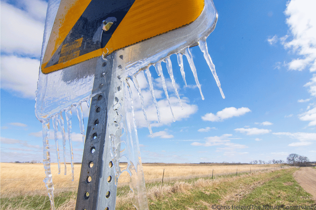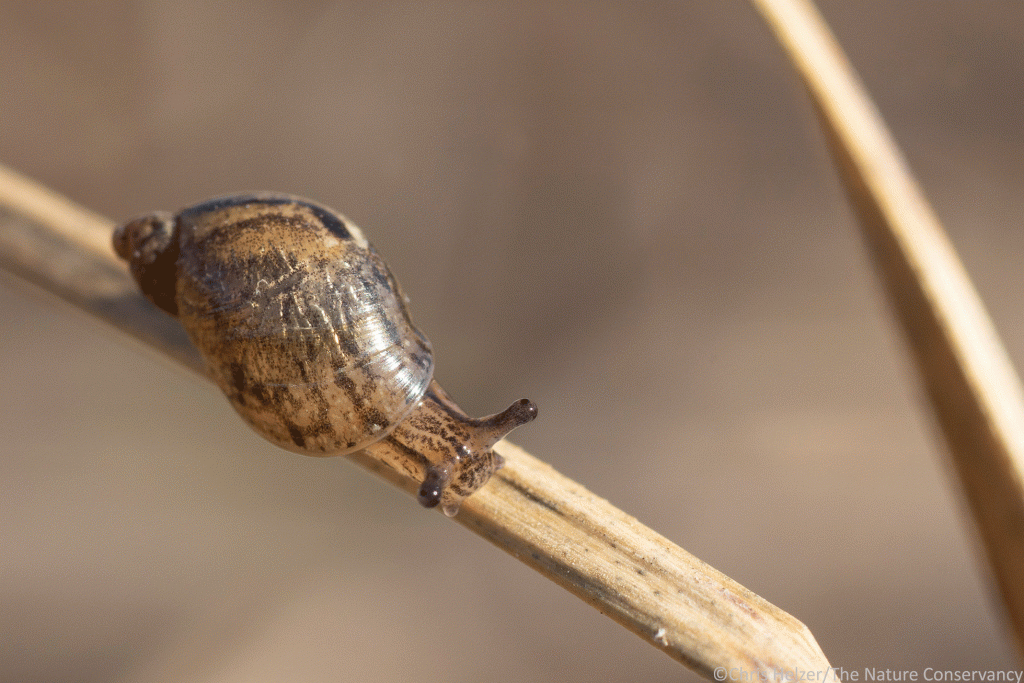 As the sun shone and temperatures rose in the days following the (mild) ice storm, ice that coated signs, fences, trees, and more started slipping and falling off in sheets and chunks.An ice coated fence post and barbed wire.Even on prairie grasses, it was obvious which direction the wind had blown during the storm.This grass leaf floated gently on a stream, surrounded by ripples and reflected color.This bubble floated downstream toward me and lodged long enough for me to photograph it. When I noticed my reflection in the bubble, I waved at myself (and now at you!)This cute little snail was one of many moving around in a wet meadow after temperatures warmed up.