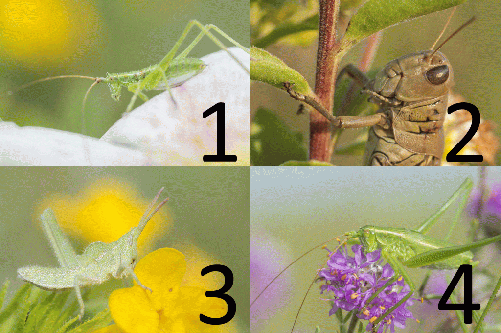 3) The answer is C. The easiest way to tell katydids from grasshoppers is by the length of their antennae. If the antennae are as long as their body or longer, it’s a katydid. Grasshoppers have short antennae by comparison.