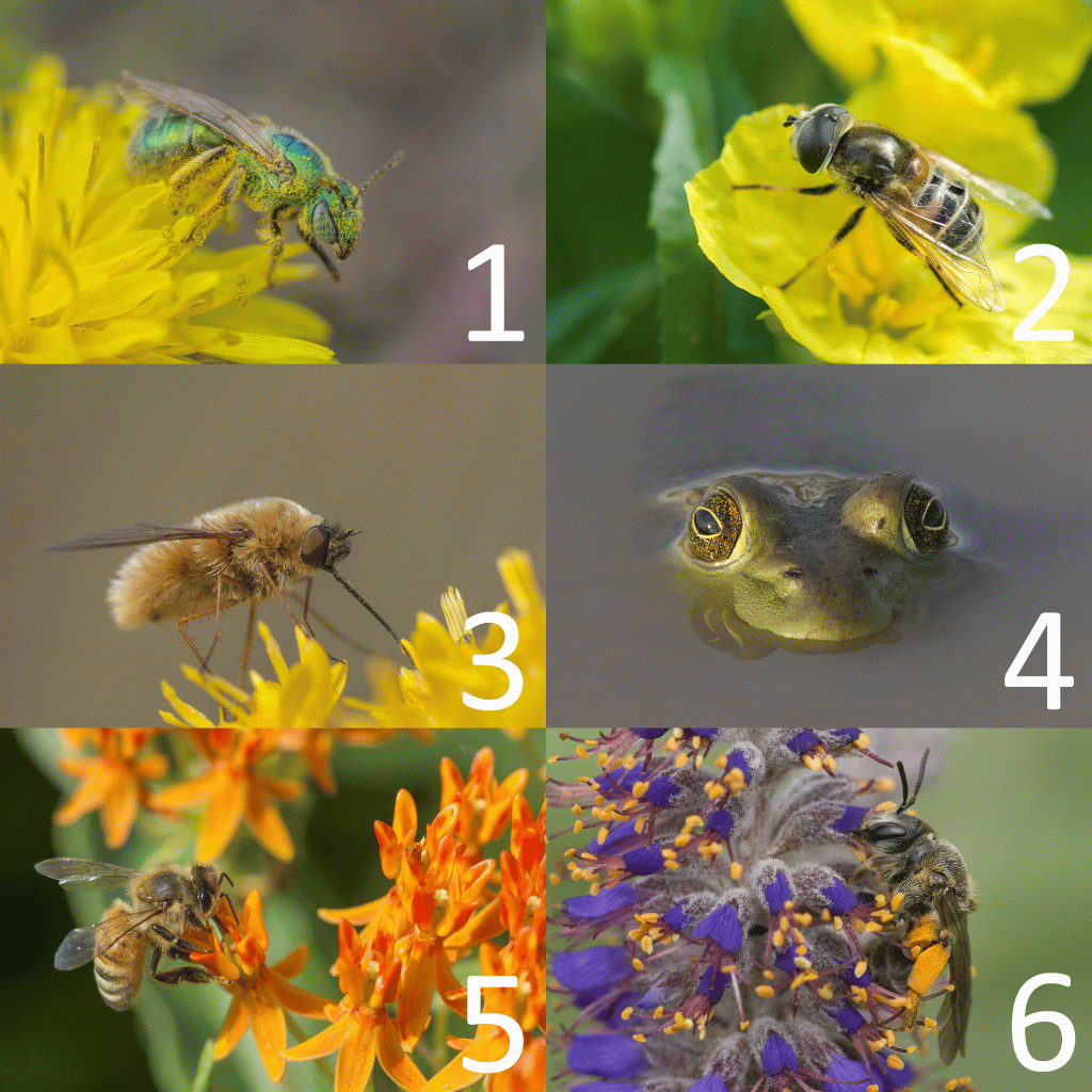 7) B. 1 and 6 are bees (Agapostemon and Andrena, respectively). 2 is a hover fly, 3 is a bee fly. 4 is a bull frog (I’m confident in that identification even without seeing the back legs). 5 is a honey bee, which is not native to the U.S. You can read more about bees, including why we shouldn’t be worrying about honey bees, in my Cool Green Science blog post.
