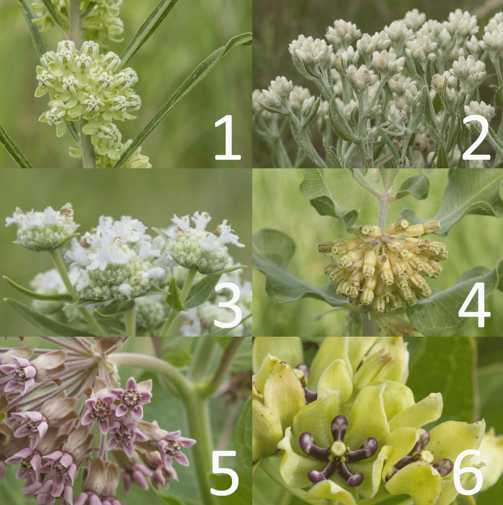 1) D is the correct answer. The species shown are: 1- Narrowleaf milkweed (Asclepias stenophylla), 2 – old field balsam (Gnaphalium jaliscense), 3 – Virginia mountain mint (Pycnanthemum virgnianum), 4 – green milkweed (A. viridiflora), 5 – common milkweed (A. syriaca), and 6 – green antelopehorn milkweed (A. viridis)