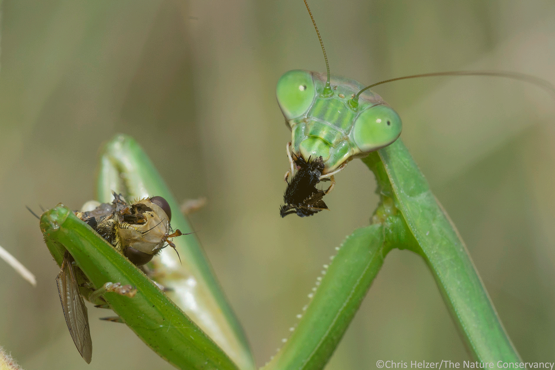 Chinese praying mantis eating a tachnid fly. Lincoln Creek Prairie.