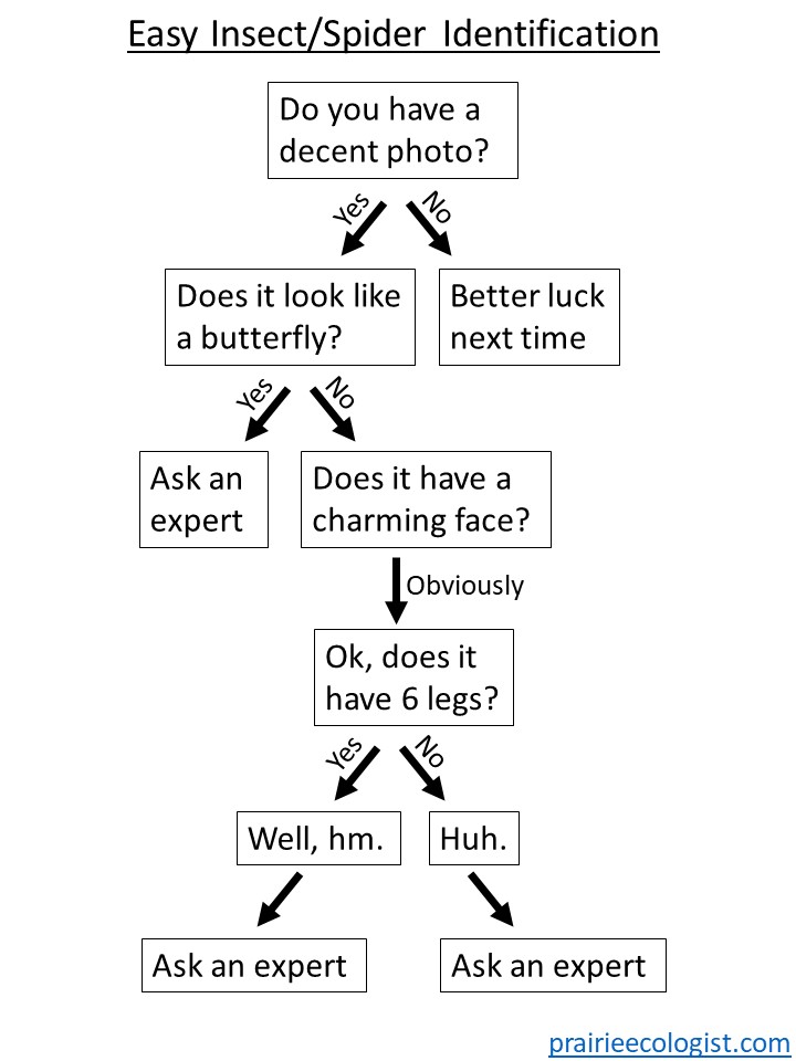 There are, of course, multiple terrific resources available for the identification of invertebrates. Those include various old school field guides, as well as online resources such as iNaturalist and Bugguide. I see my method as complementary to those other resources, if considerably easier to use. It works for any species of insect, spider, or other invertebrate (and, honestly, with vertebrates and plants too). All you need is a reasonably good photo of whatever it is you’re trying to identify. Then, just follow the simple chart below and identify your bug!