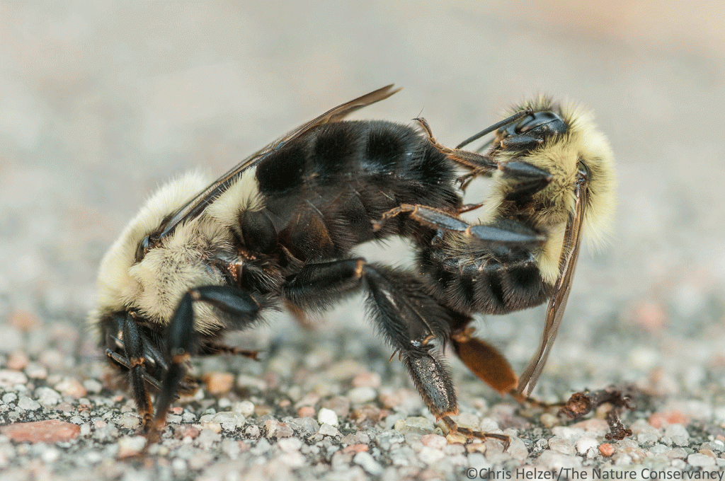 These mating bumble bees (Common eastern bumble bee – Bombus impatiens) show the massive size of the females who will be next year’s queens.