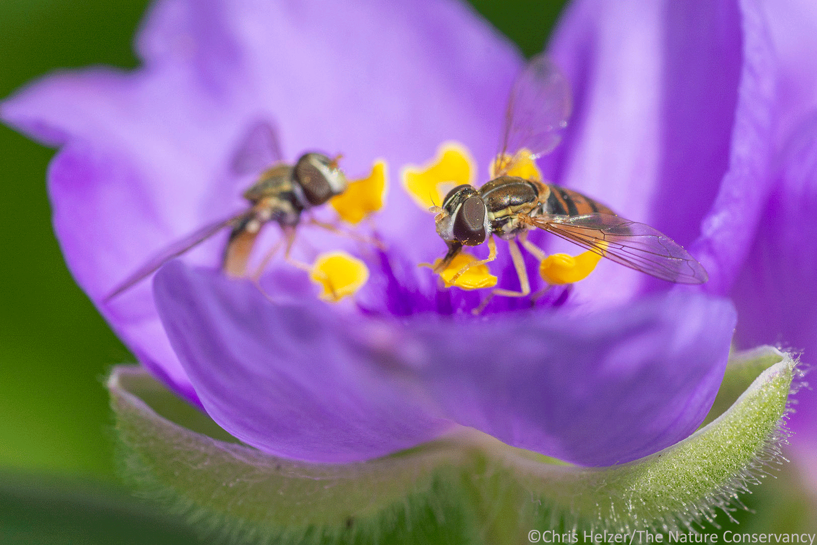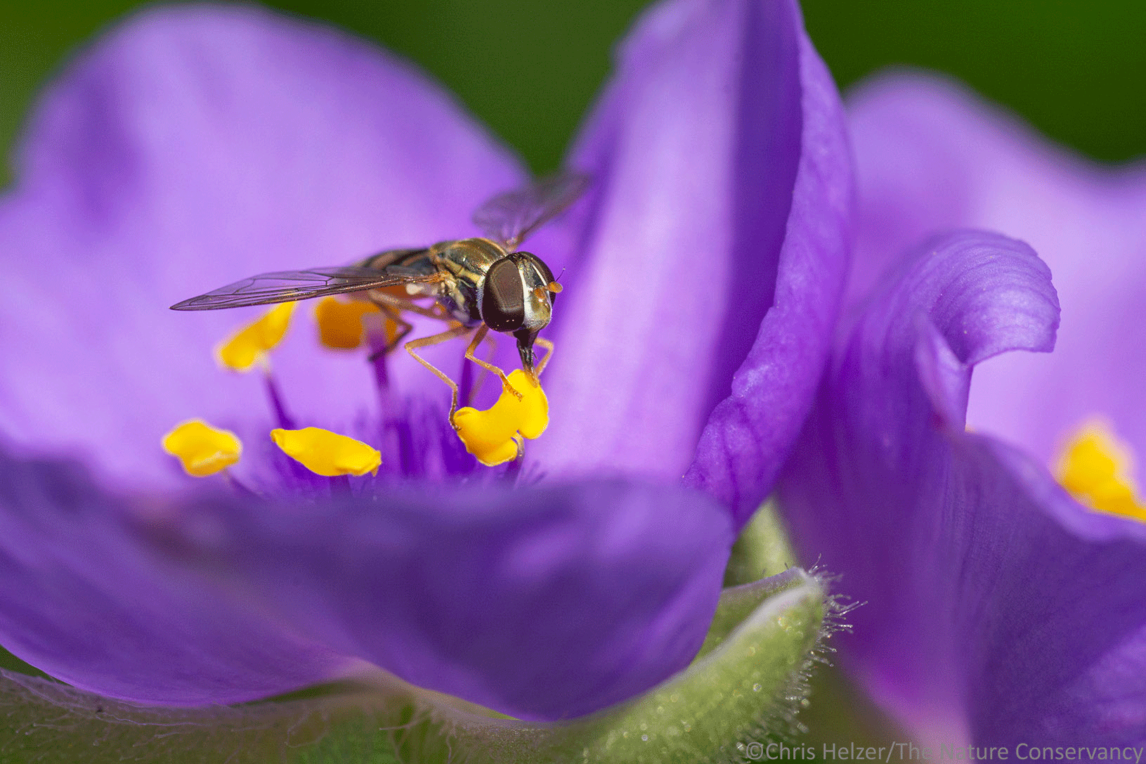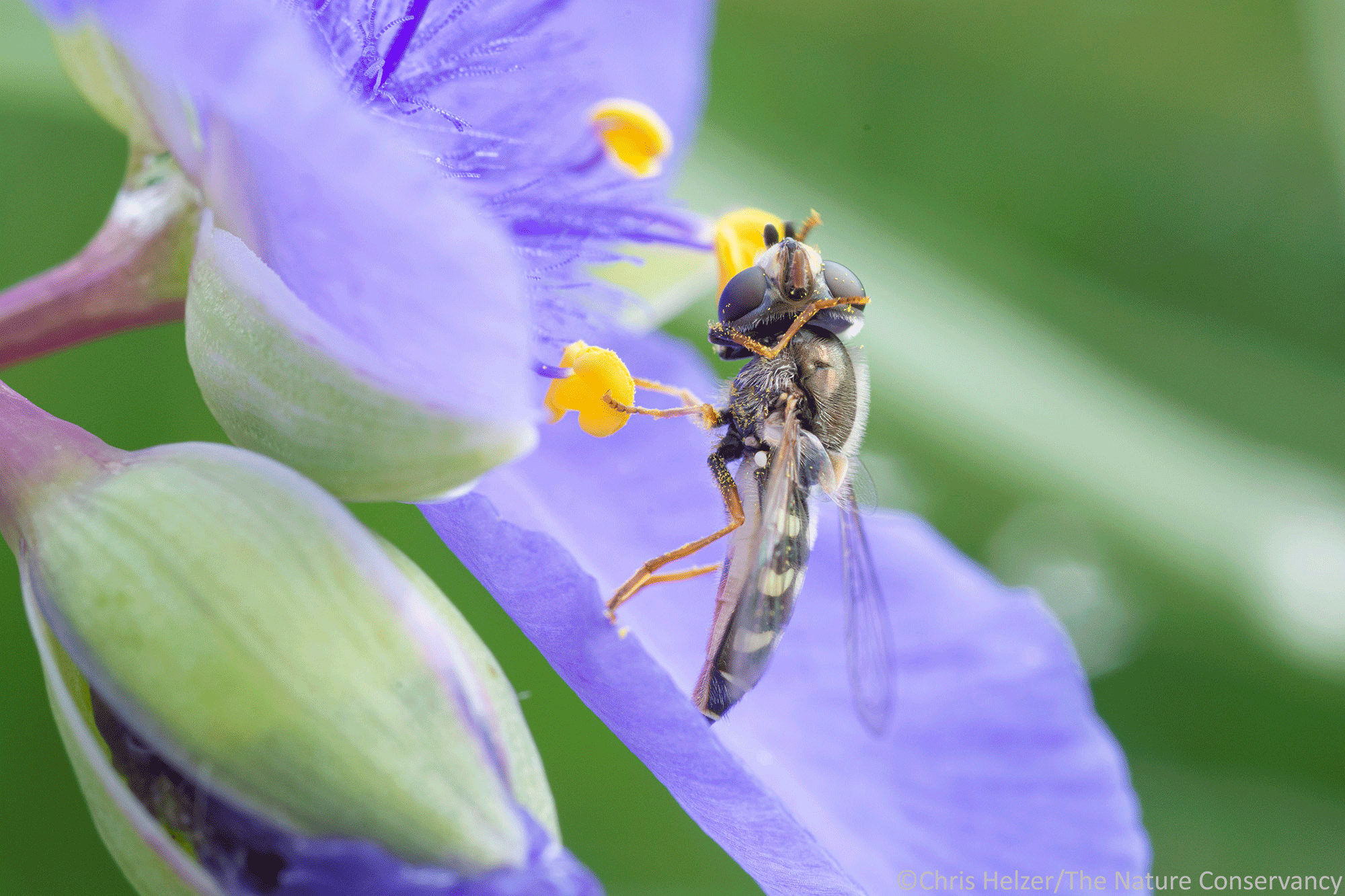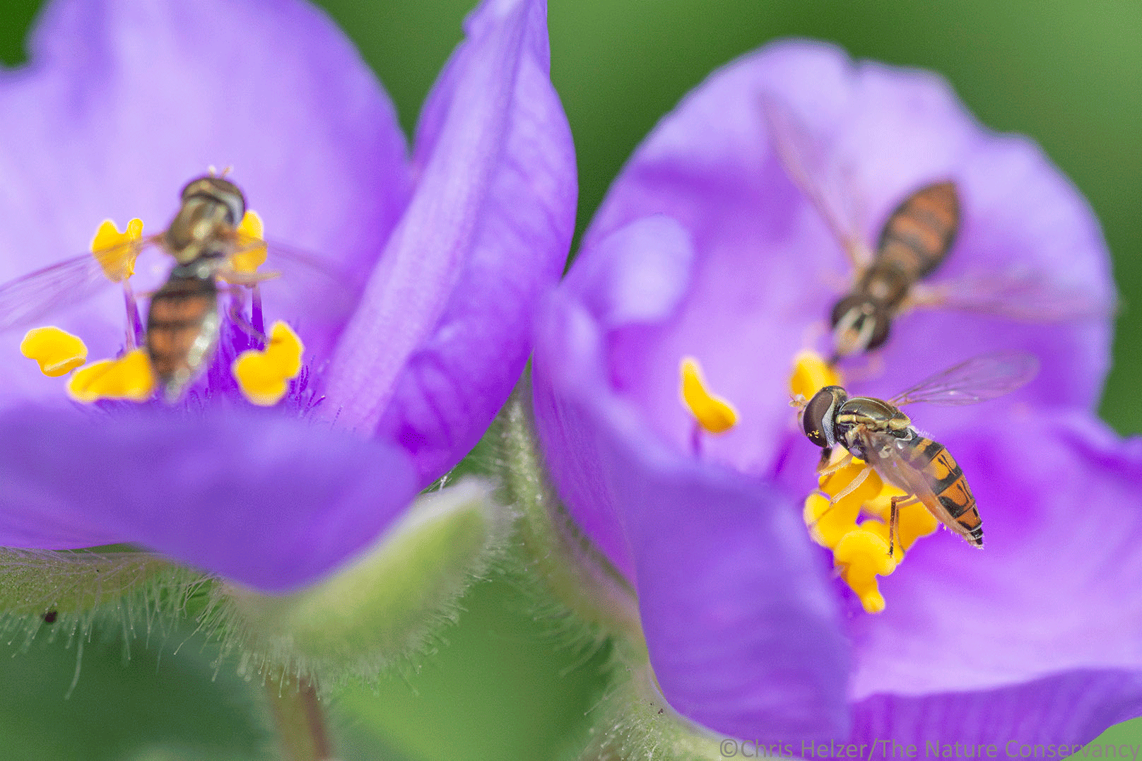 Each year, when spiderworts (Tradescantia sp) start blooming in our backyard prairie garden, I wander out to take photos of the hover flies that seem particularly attracted to the flowers. The tradition continued this week and I have a nice crop of fly photos to share, including a goofy one at the end of the post.