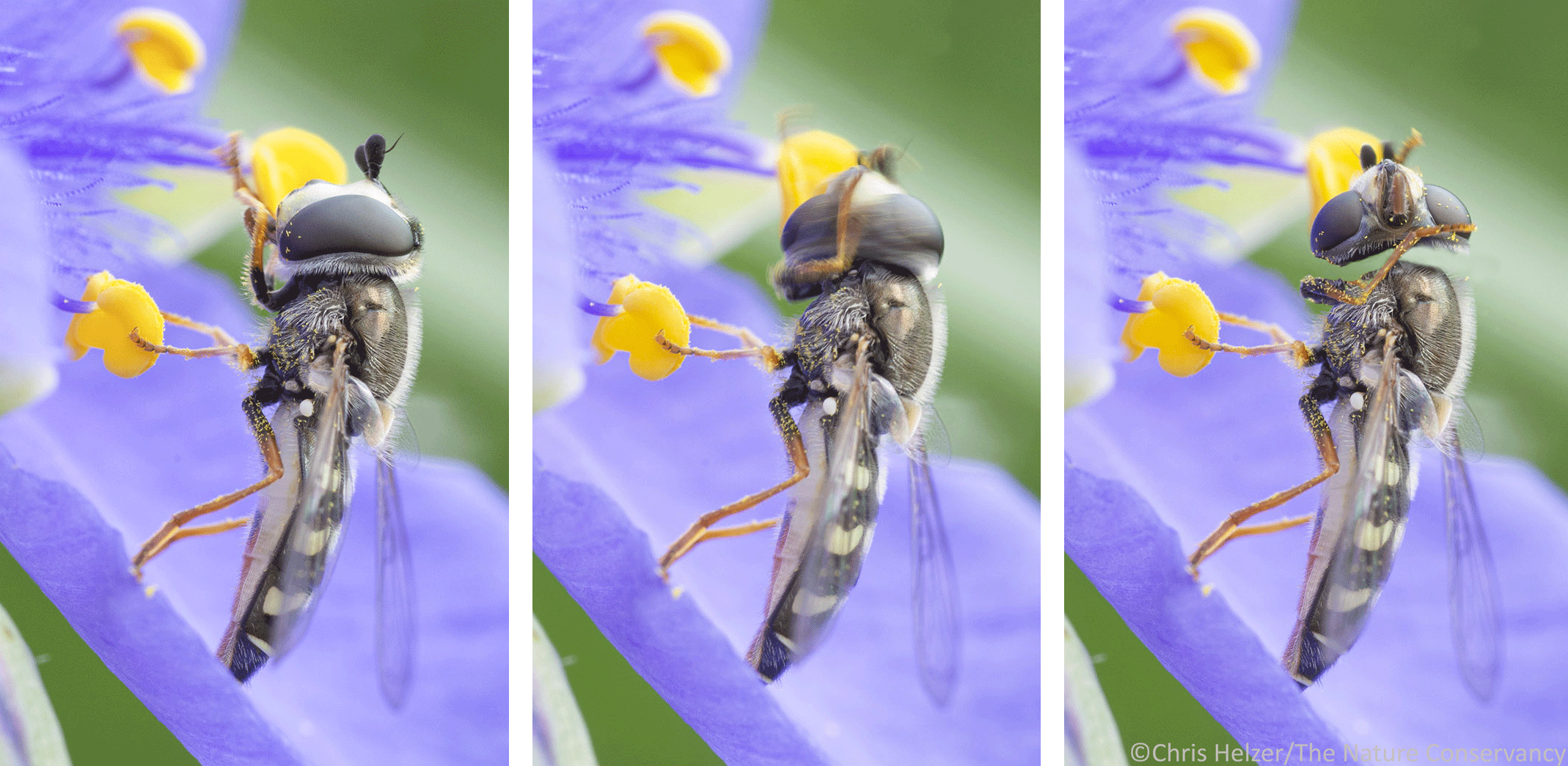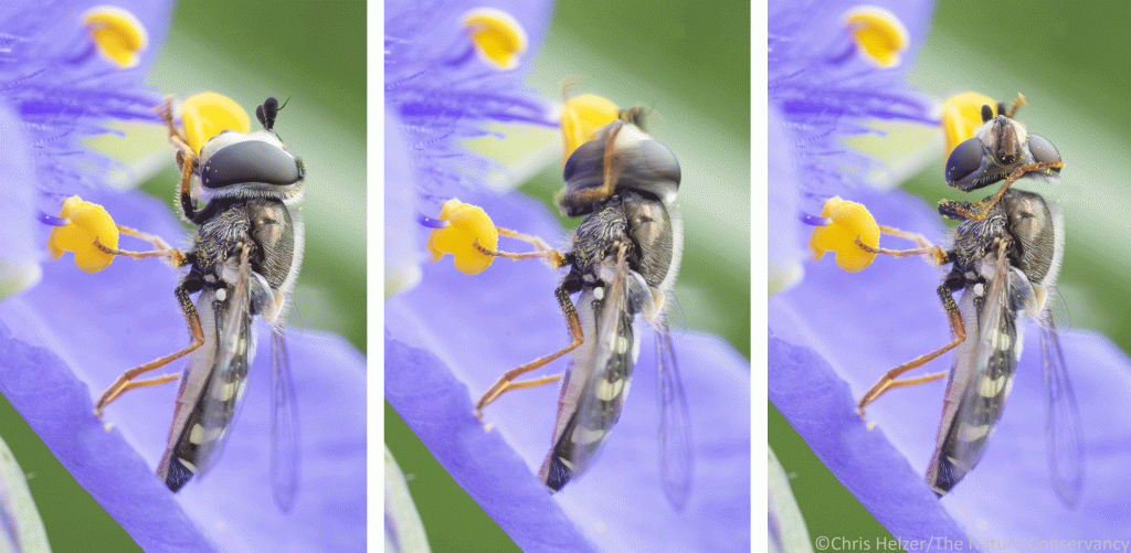 The fly in the above photo was using its legs to wipe pollen off its face while swiveling its head around. Not long after this photo, I got another shot mid-swivel, catching the blur of the moving head. Later, as I browsed through the photos on my computer, I enjoyed the sequence of those two photos (twisted head and mid-swivel), along with another with the head in its more typical position.