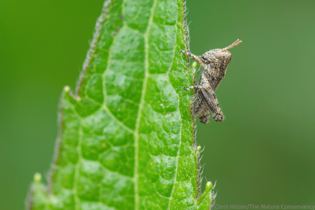 A tiny grasshopper nymph in our backyard prairie garden.