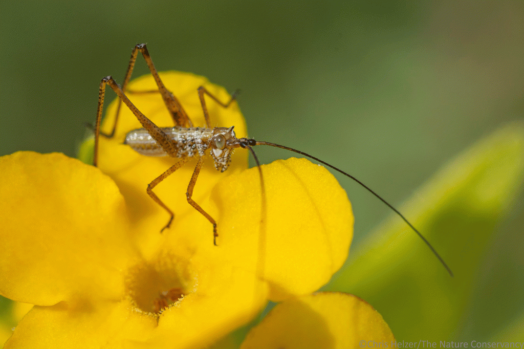 A katydid nymph on hairy puccoon. Niobrara Valley Preserve.