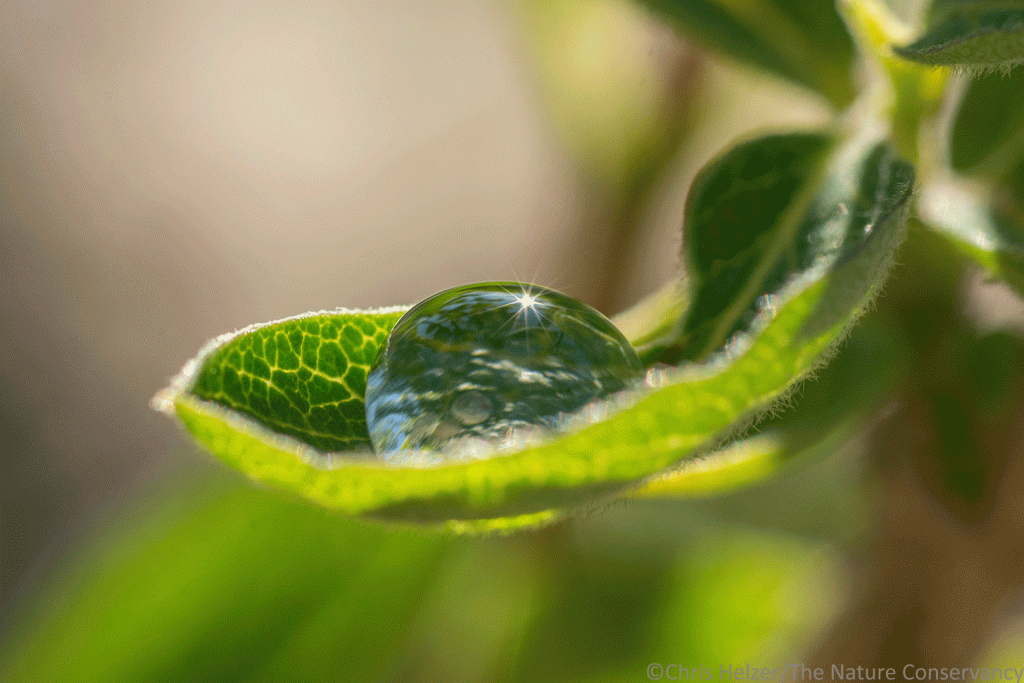 A rain drop perched on a cup-shaped leaf of coralberry (Symphoricarpus orbiculatus). Niobrara Valley Preserve