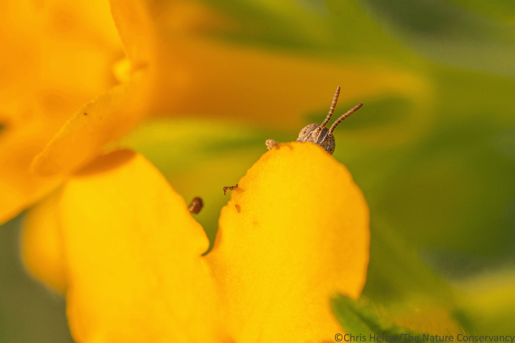 Grasshopper nymph and hairy puccoon. Niobrara Valley Preserve.