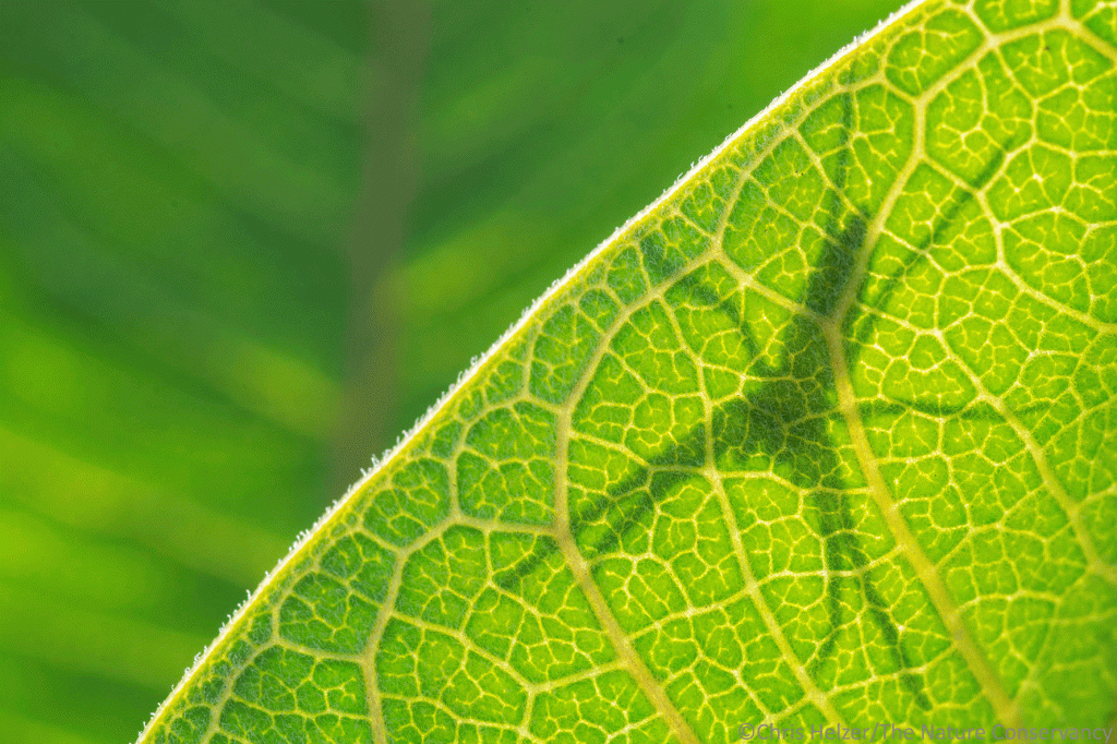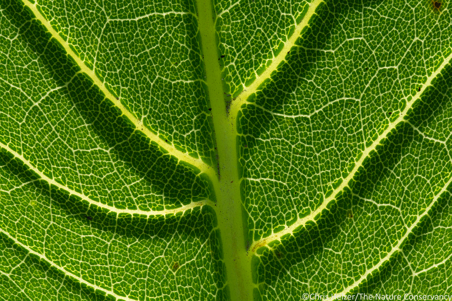 Here are a few specific tips for photographing backlit leaves on bright days. First, try to find leaves that are large and relatively flat. In addition to the species shown in the above photos, I often seek out leaves of stiff goldenrod (Solidago rigida) and wild grape (Vitis riparia) – but there are lots of other options too. Flat leaves tend to work best because you can set your camera up in a way that the entire leaf is perpendicular to your lens. That reduces the depth of field you need to get most of the leaf to be in focus. I also try to find leaves that are fully illuminated (not broken up by shadows from other leaves). Once you find your subject, use a shutter speed fast enough to counteract whatever breeze might be blowing – but use as much depth of field as you can (big f/stop number).