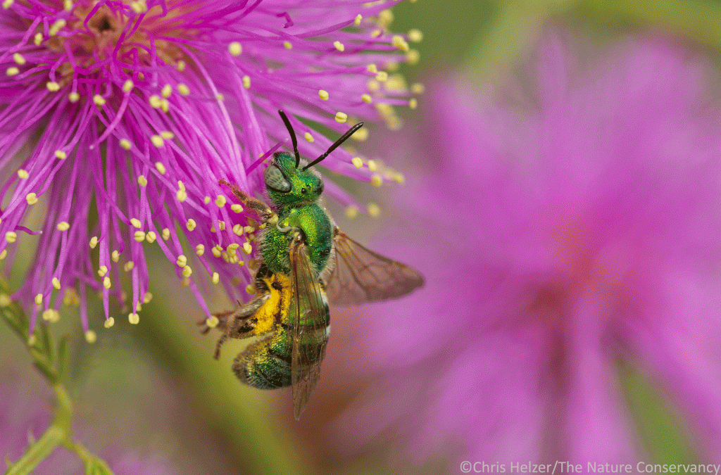 A green metallic sweat bee on sensitive briar (Mimosa quadrivalvus).
