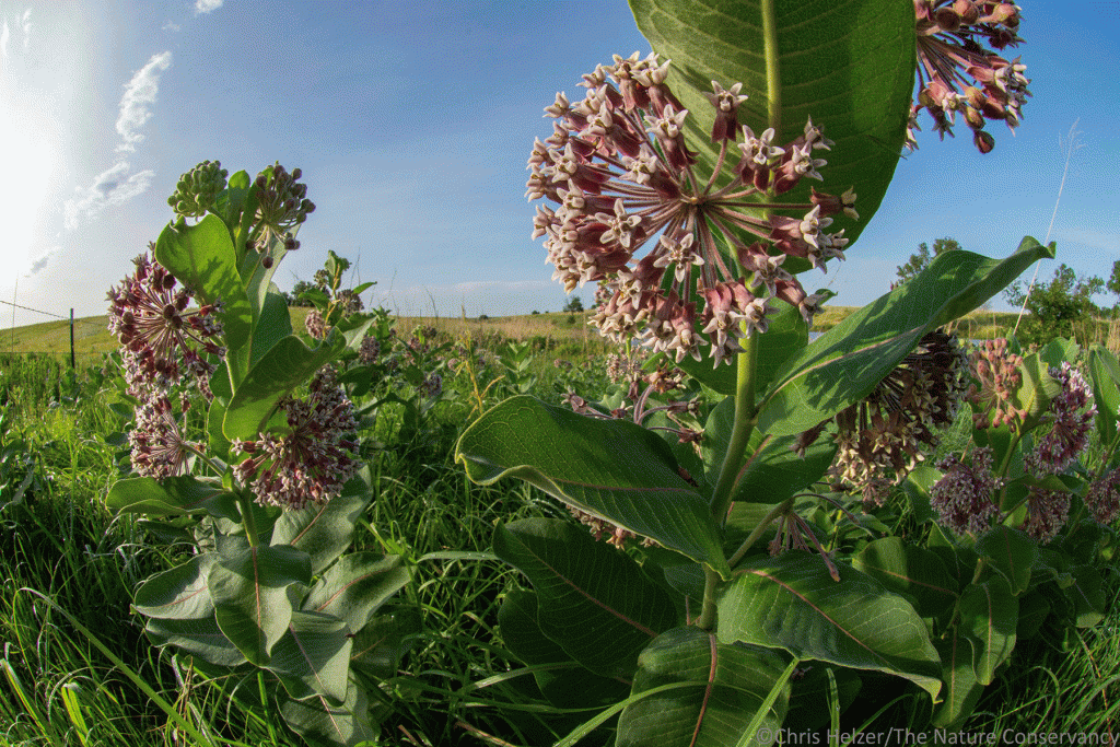 Common milkweed is found across the whole prairie, but reaches particularly high abundances around the pond and in a few other small pockets of prairie grazed less frequently and intensively than elsewhere.