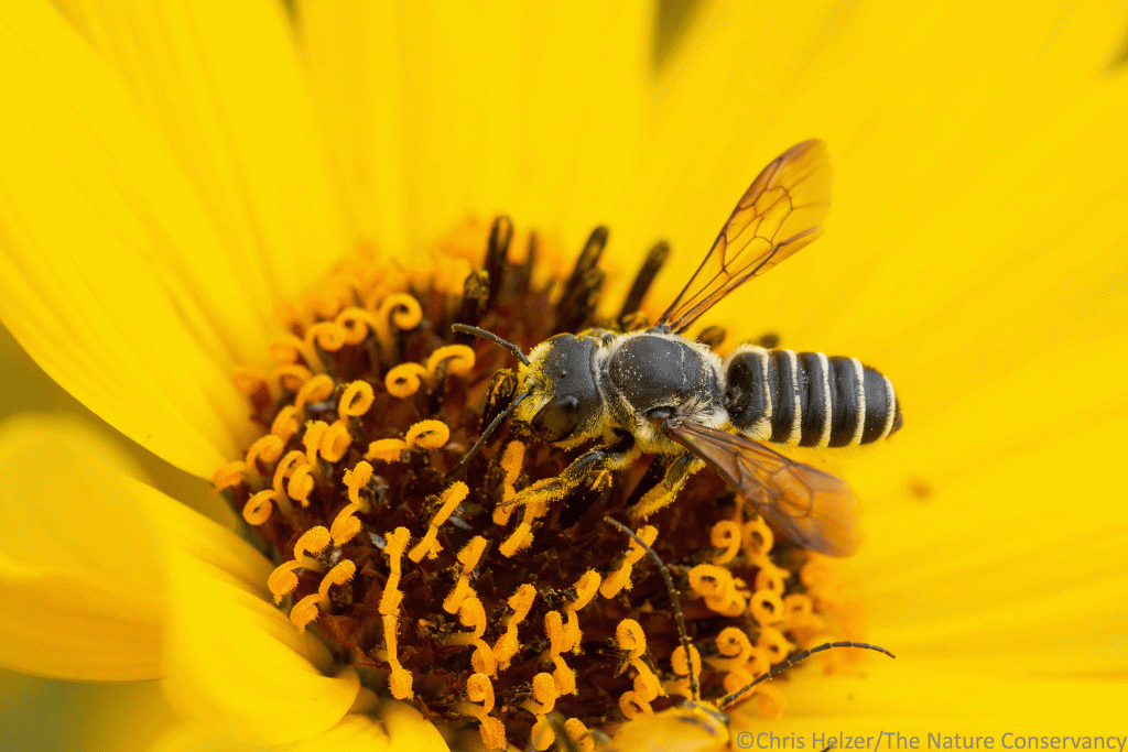 Leaf cutter bee on stiff sunflower. Nikon 105mm macro lens. ISO 500, 1/320 sec, f/13.