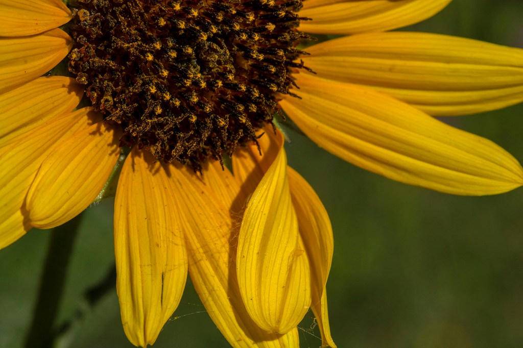 My final stop was Fort Robinson State Park. Unfortunately, because of COVID-19 most of the historical and educational buildings were closed, but the hiking trails were still open to the public. I hadn’t gotten the opportunity to do a lot of macrophotography on the trip so far. That was partially because there weren’t a lot of wildflowers blooming, but also because most days were windy. Wind is great for keeping cool during a long hike, but not so great for capturing flowers and insects that aren’t blurry. However, one morning the wind died down so I took the opportunity to go out and see what I could find and wasn’t disappointed. I came upon a sunflower with its petals stuck together. I inspected further and realized that there was a spider web holding them in that position. I sat patiently and lightly knocked at her door, and eventually the spider graced me with her presence. She was a beauty.