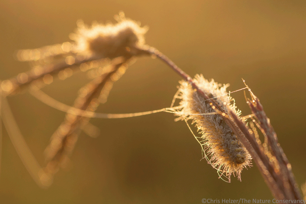 Yesterday, I was back out at the prairie to catch the sunrise and I saw the caterpillar clusters again, but this time, there was a stark difference. Many of the caterpillars were way up high in the canopy – at the tops of grasses, forbs, and even fence posts. And many of those high elevation caterpillars were dead. Some were still intact, but others were withered or empty-looking shells of their former selves. The calm winds, dewy conditions, and warm-colored sunlight made for some great photography, but I spent much of the time distracted by the mystery – why were all these caterpillars climbing up high and dying?