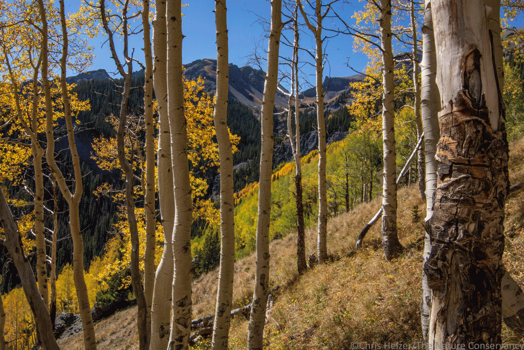 Aspens on a south-facing slope along the Oak Creek Trail west of Ouray, Colorado – from one of our two day hikes prior to our overnight backpacking trip. Tokina 11-20mm lens @20mm. ISO 200, f/22, 1/60 sec.
