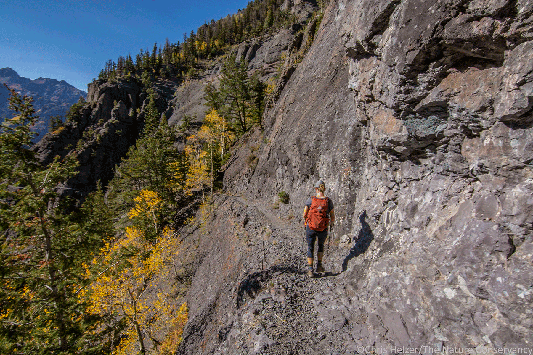 Hiking the Bear Creek National Recreation Trail along a very narrow path cut by miners long ago. Tokina 11-20mm lens @12mm. ISO 320, f/22, 1/80 sec.