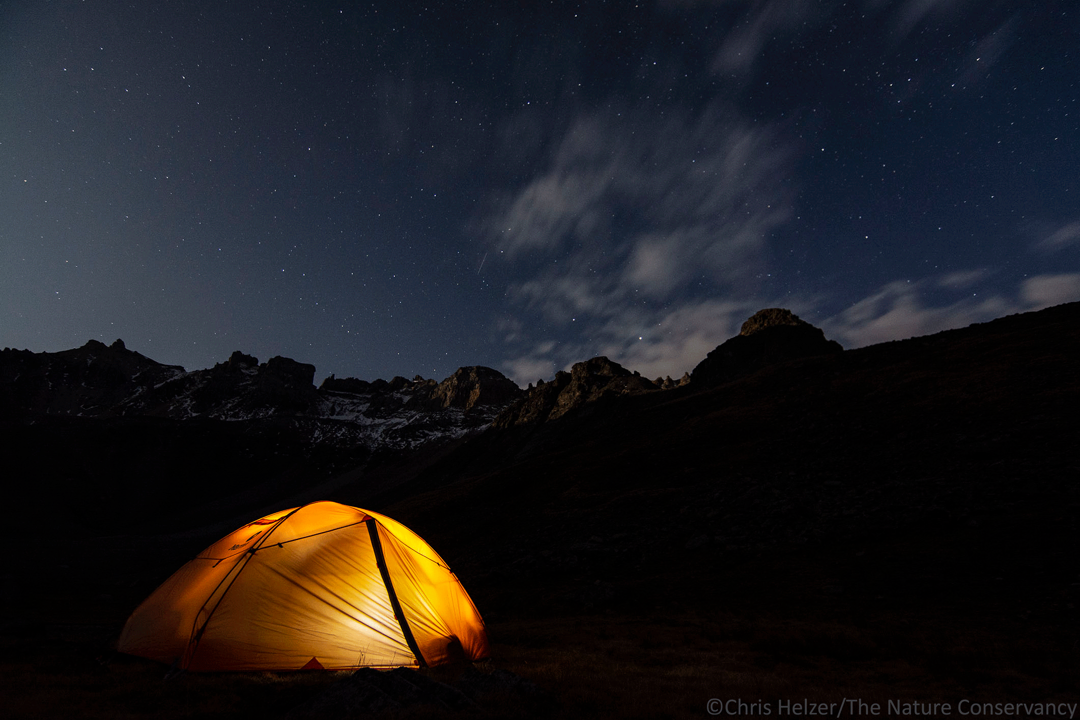 Kim was in the tent with a flashlight while I was outside trying to capture stars and the glow of the rising moon to the east (left side of this photo). The very top of the ridge behind the tent was catching light from the moon. Tokina 11-20mm lens @11mm. ISO 640, f/2.8, 10 sec.