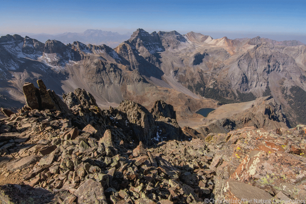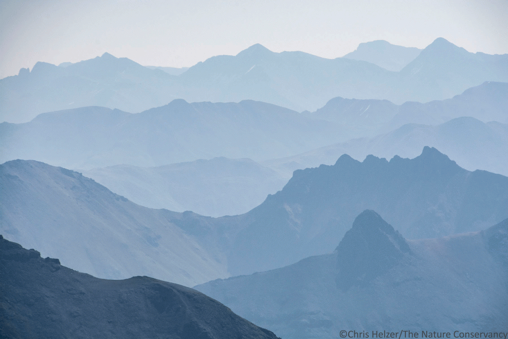Mountain ridges and haze/smoke off to the east of the top of Mount Sneffels. Nikon 18-300mm lens @220mm. ISO 500, f/13, 1/1600 sec.