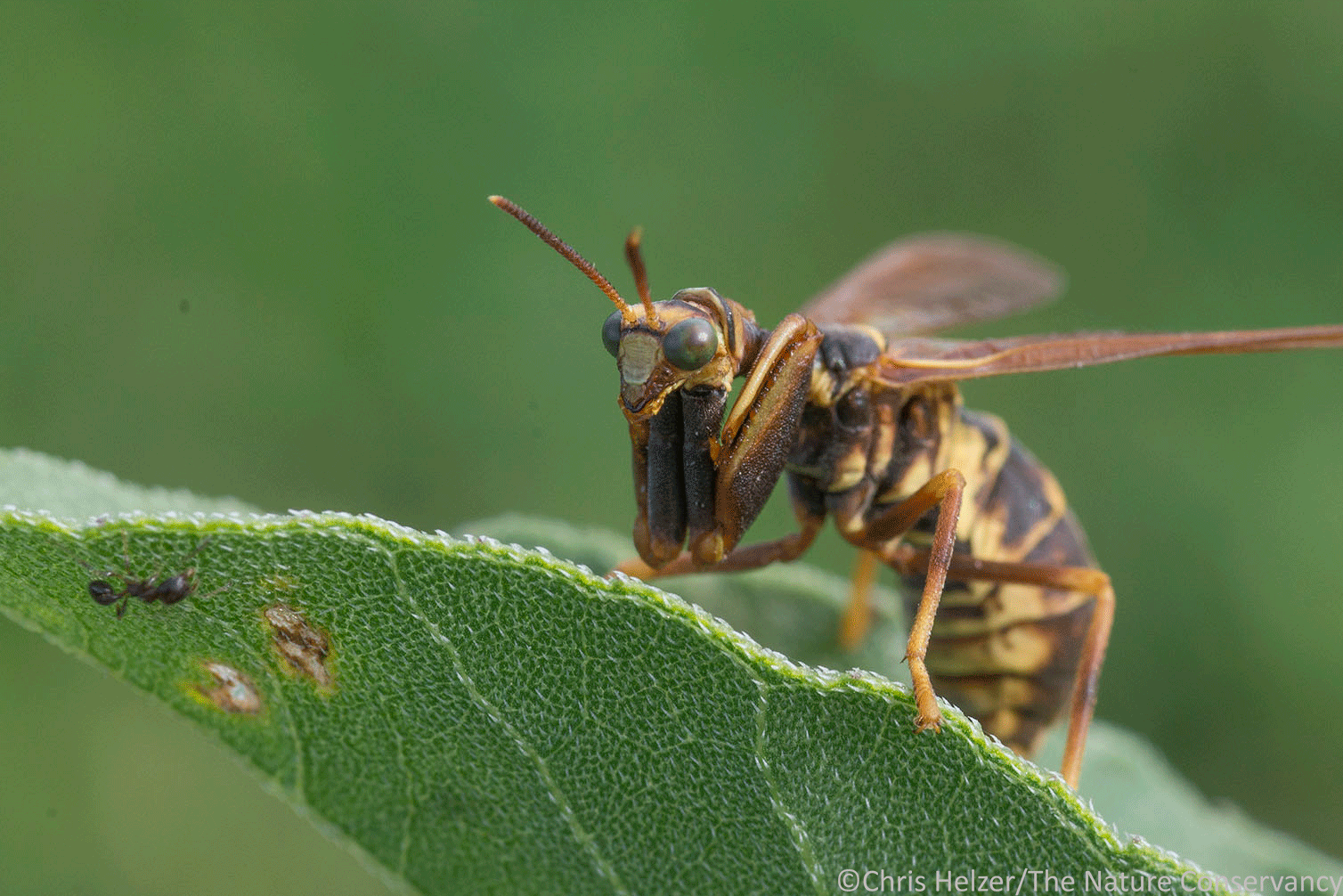 Alternatively, some small creatures mimic the appearance of others. There are robber flies that look nearly identical to bumble bees, for example, which can fool their prey into assuming they’re harmless. Another of my favorites is the wasp mantidfly, which is a predator with praying mantis-like front legs on a body that looks very much like a paper wasp.