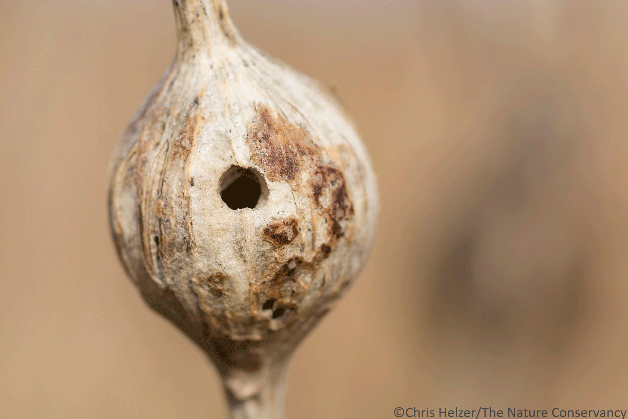 This goldenrod gall shows the exit hole where an adult fly emerged after spending the winter inside it.