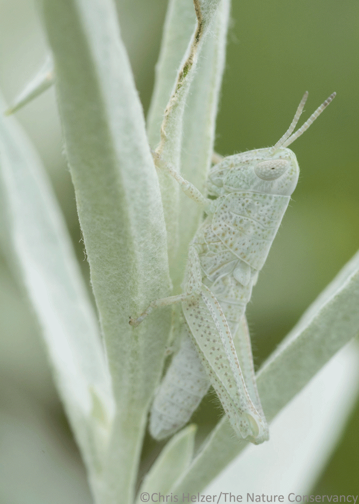 When I think of camouflage, I usually picture something that conceals a creature (or object) by making it blend into its surroundings. The moth in the above photo is a great example of that. If I hadn’t seen the moth move, I never would have spotted it. Another example I see a lot in Nebraska prairies is the cudweed grasshopper (Hypochlora alba), which conveniently matches the color and pattern of the leaves on its favorite food – cudweed sagewort, aka white sage (Artemisia ludoviciana). When I’m leading tours, I pay close attention as I walk through patches of sagewort, looking for the pale insects jumping away from my feet. Then I try to grab one, along with a sample of the plant, to show people its supremely effective camouflage.