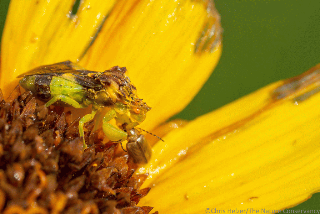 An ambush bug that has caught a beetle. In this case, the color of the ambush bug is a pretty good match with the sunflower it is hunting on, but often, the pattern and texture of the bug is enough to hide it, regardless of color.