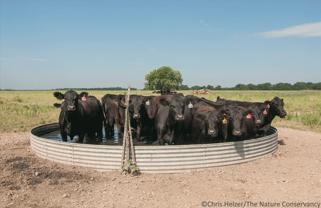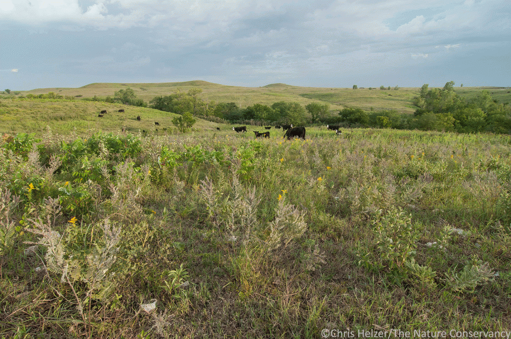 Cattle graze in a high-diversity prairie restoration in The Nature Conservancy’s Platte River Prairies, Nebraska.