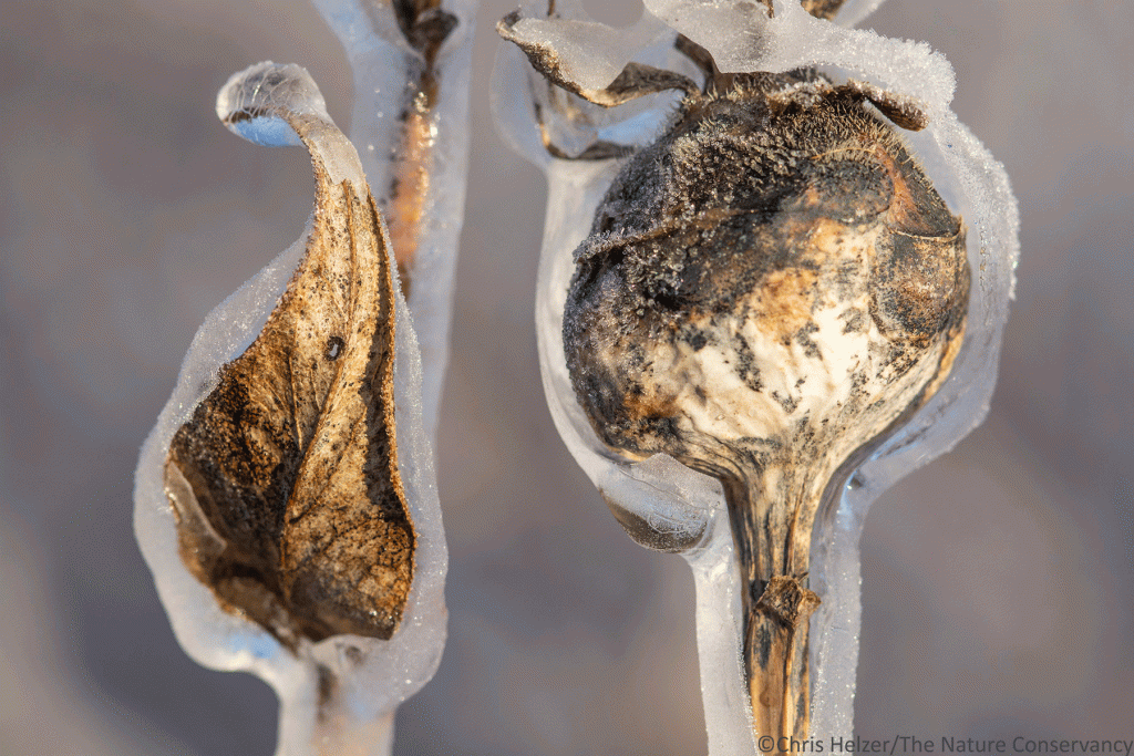 Rosinweed and ice. Lincoln Creek Prairie. Nikon 105mm macro lens, ISO 320, f/9 at 1/500 sec.