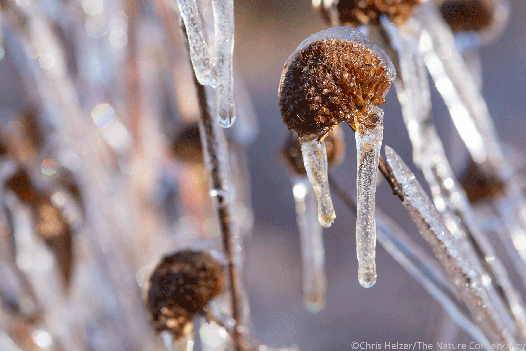 Stiff sunflower and ice. Lincoln Creek Prairie. Nikon 105mm macro lens, ISO 320, f/7 at 1/640 sec.