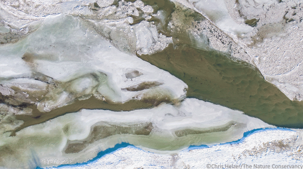 Central Platte River with ice and snow at The Nature Conservancy’s Platte River Prairies. DJI Mavic Zoom drone. 4.5mm lens. ISO 100, 1/400 sec at f/2.8.
