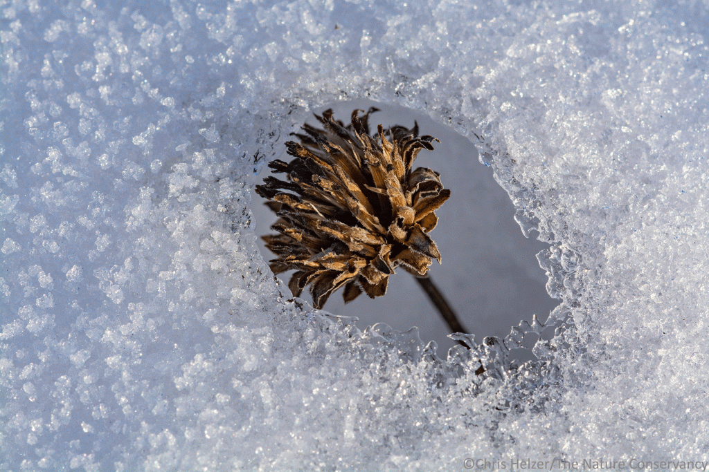 Maximilian sunflower seed head in a snow window at Lincoln Creek Prairie. Nikon 105mm macro lens. ISO 320, 1/320 sec at f/14.
