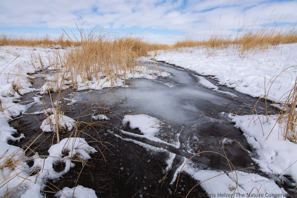 As extremely frigid temperatures finally slipped away yesterday, the two new Hubbard Fellows (stay tuned for introductions next week) and I spent some time exploring restored prairie and wetlands. Our Platte River Prairies land steward, Cody, joined us for a while too. We had a grand old time wandering and discussing prairie ecology and restoration. When we came across a wetland slough that looked particularly attractive, we switched topics, got cameras out, and started talking about photography.