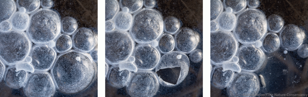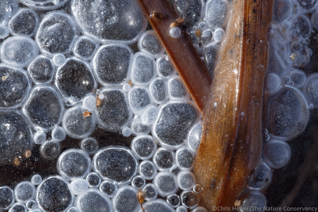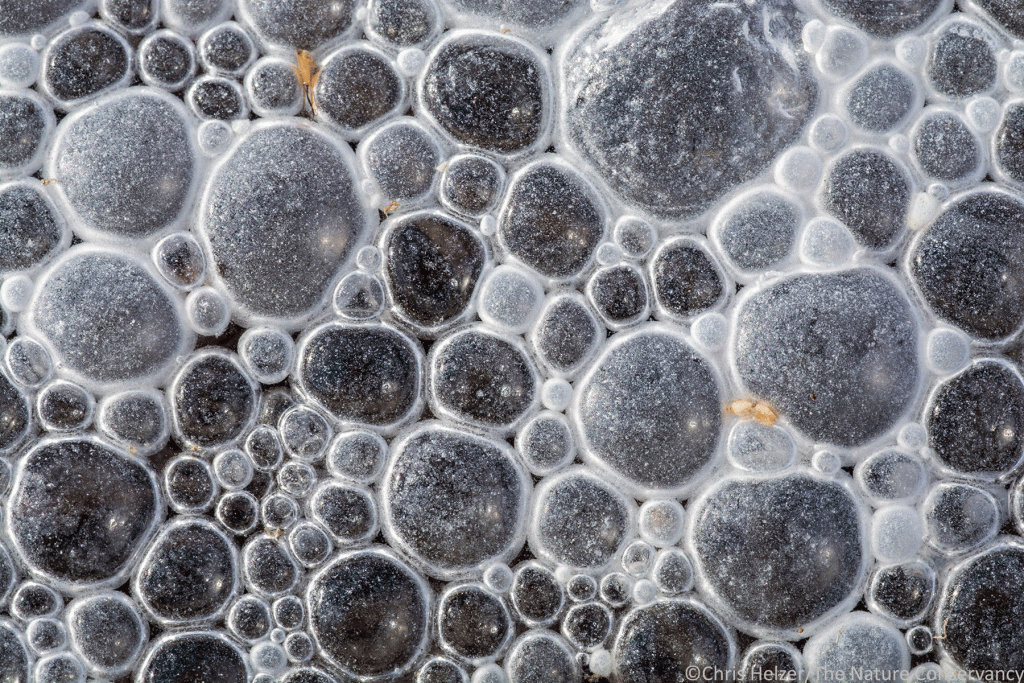 Over the next half hour or so, the Fellows acquainted themselves with the camera, lenses, and tripod each was assigned as part of their fellowship. Trying to remain accessible for questions but giving them some space to experiment on their own, I started exploring the edge of the wetland with my own camera. Soon, I was kneeling down to photograph frozen bubbles floating in small patches of open, adding wet knees as a complement to my already soggy feet. Frozen bubbles though!
