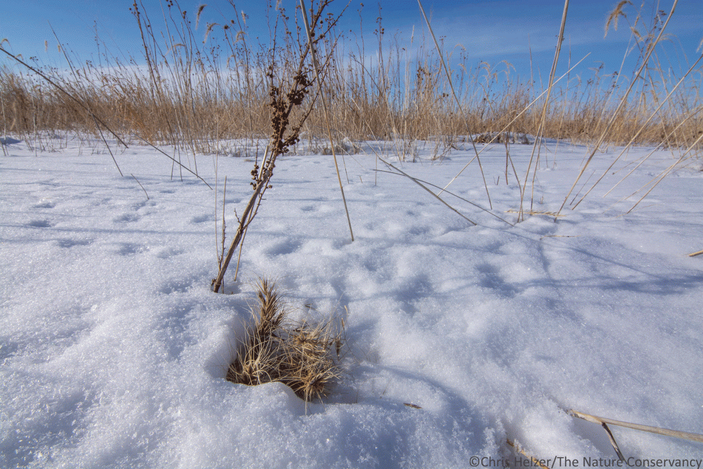 I probably could have kept photographing frozen bubbles for another half hour or more, but we had more exploring to do. We did some winter plant identification, followed and tried to interpret tracks in the snow, discussed unexplained patterns of plant establishment across the site, and generally enjoyed tromping around in the deep snow. Goldenrod galls, leftover spirals of dodder flowers on sunflower stems, a cluster of deer bed sites, and tracks of sparrows around ragweed plants were just a few of our sightings. Toward the end of the hike, I got more of my body wet when I threw myself prone on the ground to photograph a cache of Canada wildrye seeds left by a foraging mouse of some kind. In other words, it was a great afternoon!