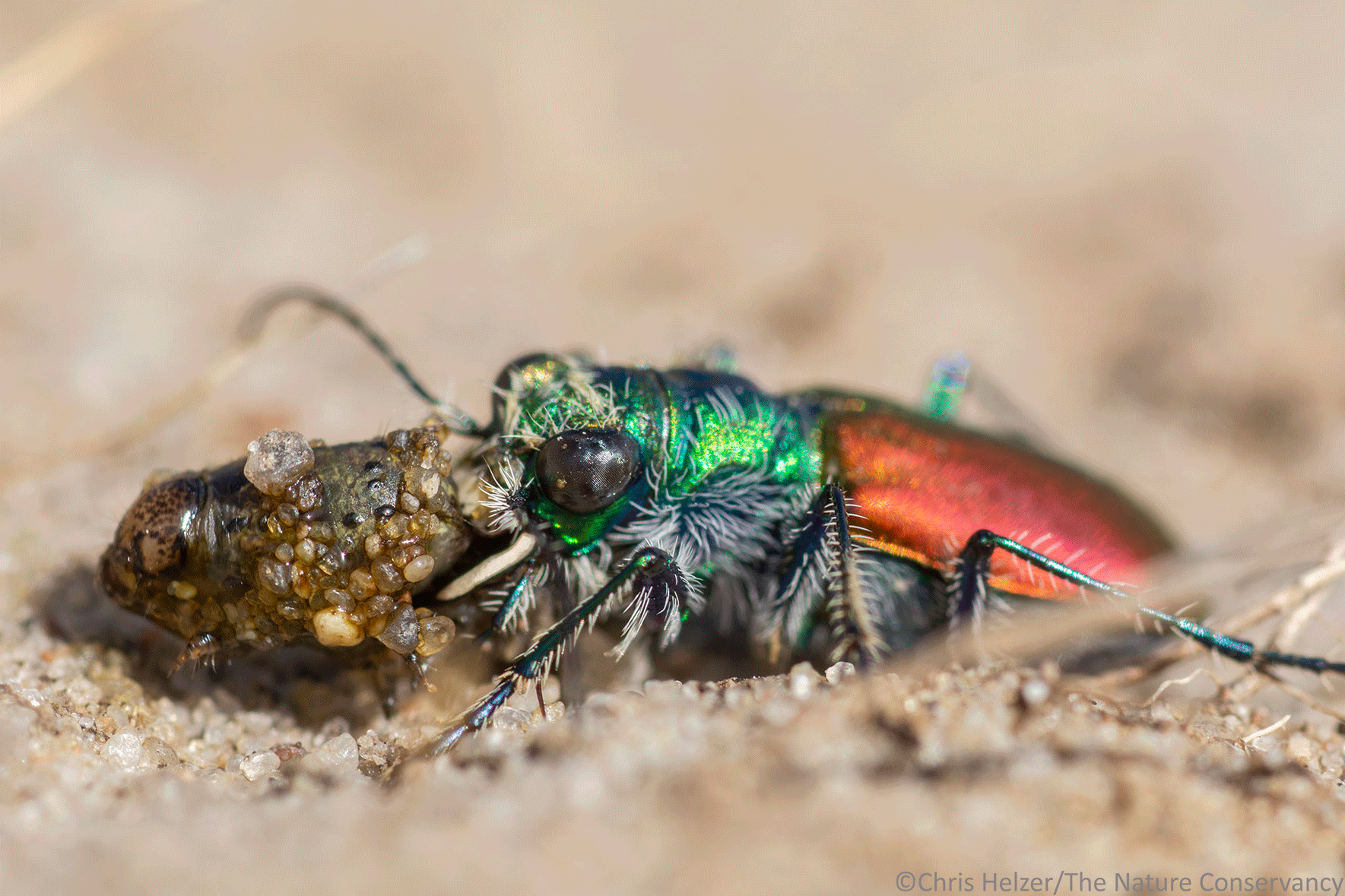 At the time, I couldn’t quite tell what the beetle’s sand-covered prey item was, but when I got home and looked closely at the images, I saw it was a caterpillar. I’ve never seen a tiger beetle eat a caterpillar before – I’ve always thought of them as catching faster prey. It makes sense, though. Why chase after fast prey when there’s a big ol’ slow-moving enchilada right there?
