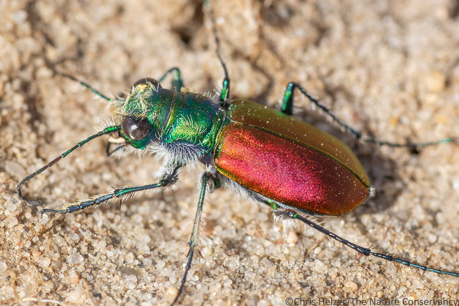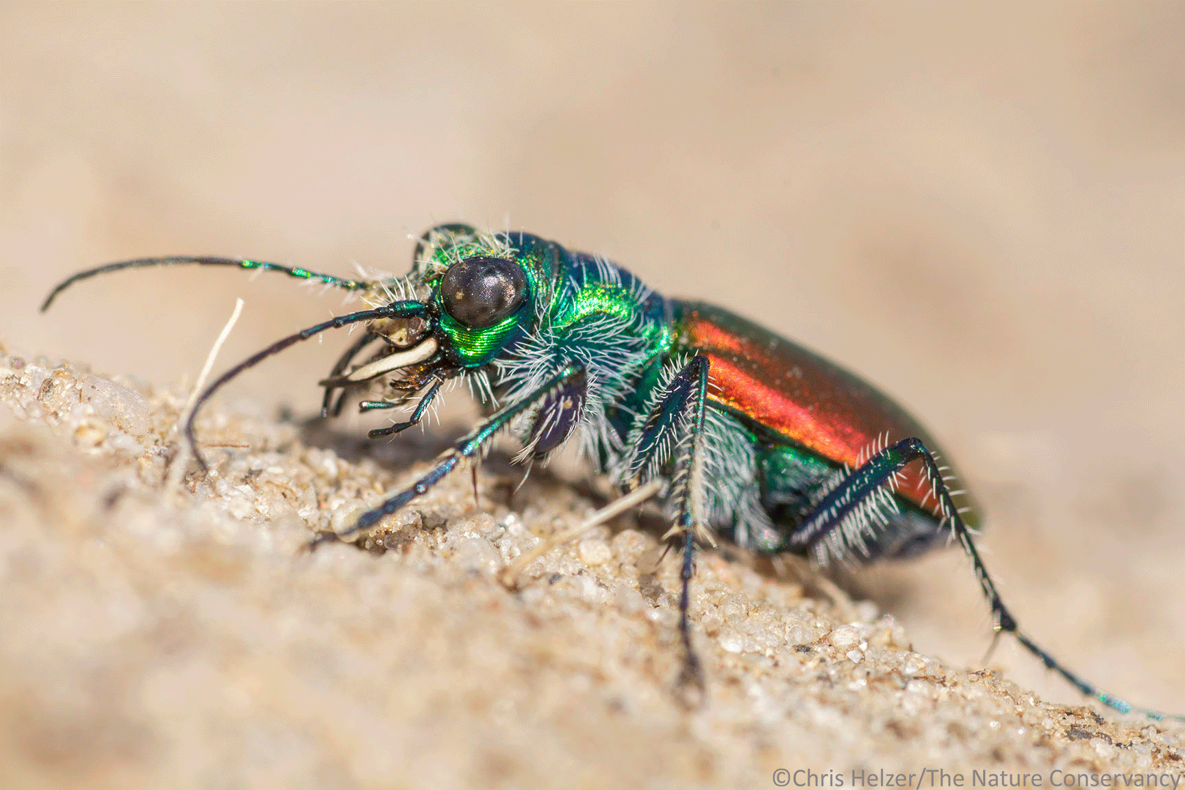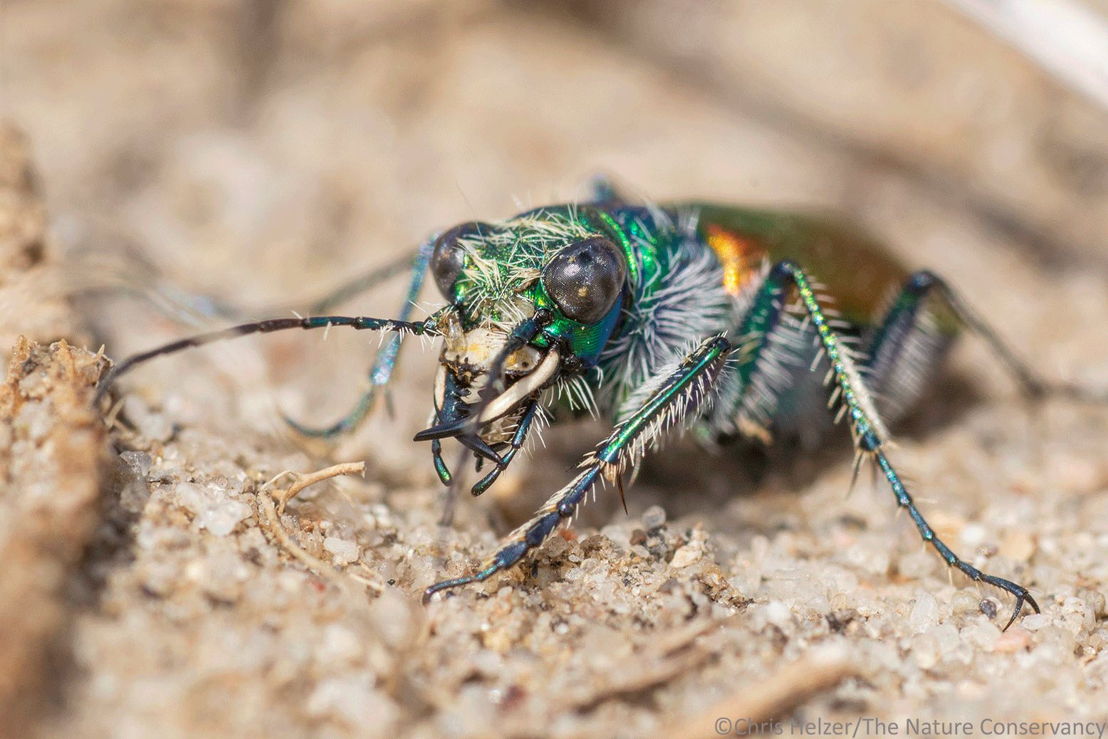 Well, those are excellent questions. I don’t know the answer to either! Hairs on invertebrates can be important for sensory purposes, defense, temperature regulation, and probably other things I don’t know about. Tiger beetles aren’t pollinators as far as I know – they like hunting and hanging out on the ground in patches of bare soil. The mouthparts are a mystery to me too – they sure are fun to photograph though!