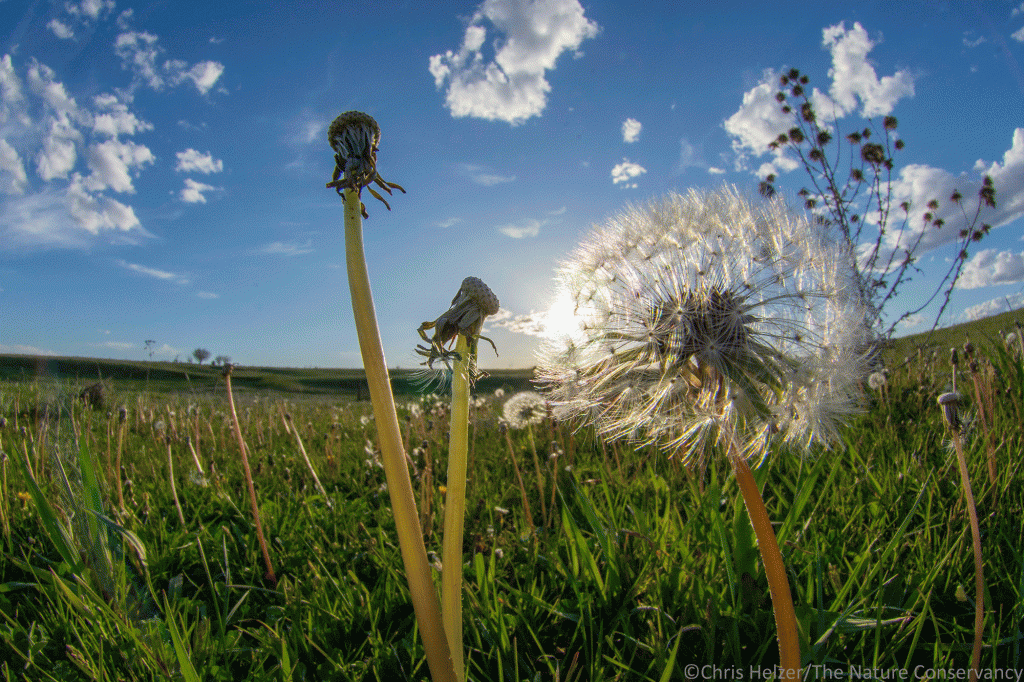 Dandelions (Taraxacum officinale). Helzer family prairie. Nikon 10.5mm fisheye lens. ISO 320, f/22, 1/200 sec.