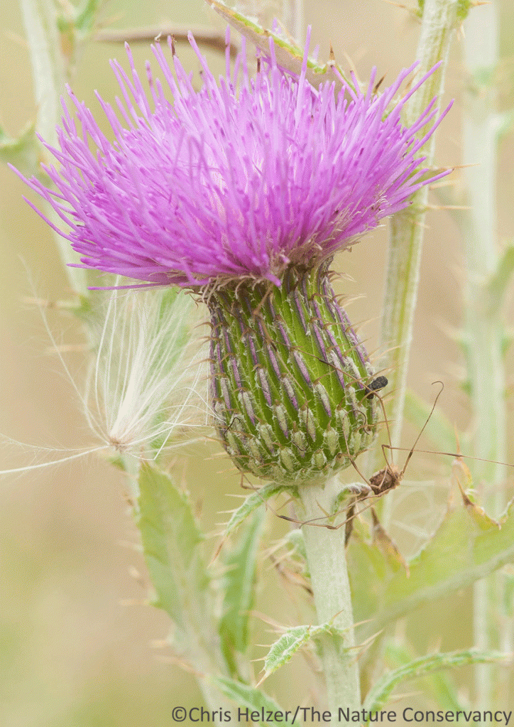 Question #7: This Flodman’s thistle (Cirsium flodmanii) is a native wildflower in Nebraska and a terrific source of nectar and pollen for many invertebrates. What is the daddy longlegs (aka harvestman) doing below the flower?