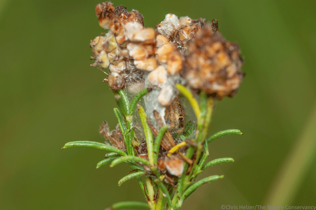 In this case, using flash was particularly useful in photographing the tiny jumping spider that had constructed a hideout at the top of a prairie clover plant. It had used silk to sew the seed heads together and seemed warm and dry when I found it, despite a rainstorm having moved through less than an hour before. I could see the spider inside, but just barely, because it was in the shade and the light from the overcast skies was already pretty dark. Using a diffused flash helped me illuminate the spider inside its shelter and highlight its big gorgeous eyes.