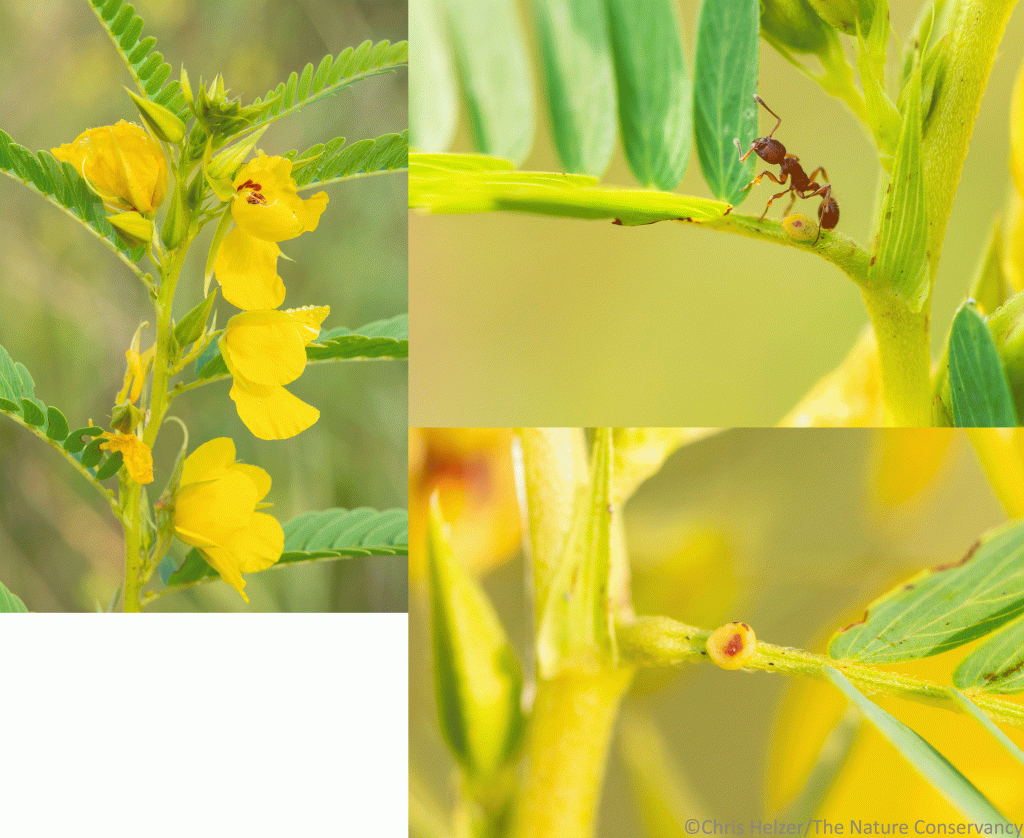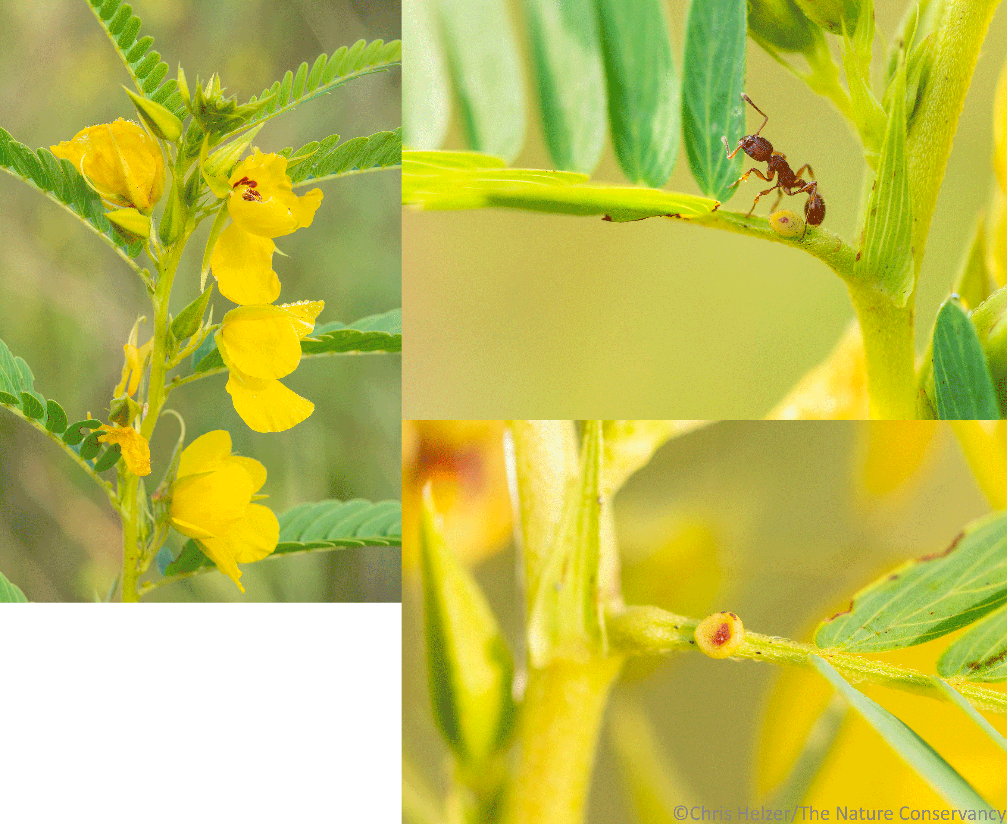 Speaking of James Trager, he was the person who initially alerted me to the extrafloral nectar produced by some prairie wildflowers. I commonly see ants scrambling around on sunflowers, for example, trying to satisfy their sweet tooth with the sugary droplets produced outside the flower on those plants. I knew partridge pea also produced extrafloral nectar, but the species isn’t common in the prairies I visit most, so I don’t see it often.