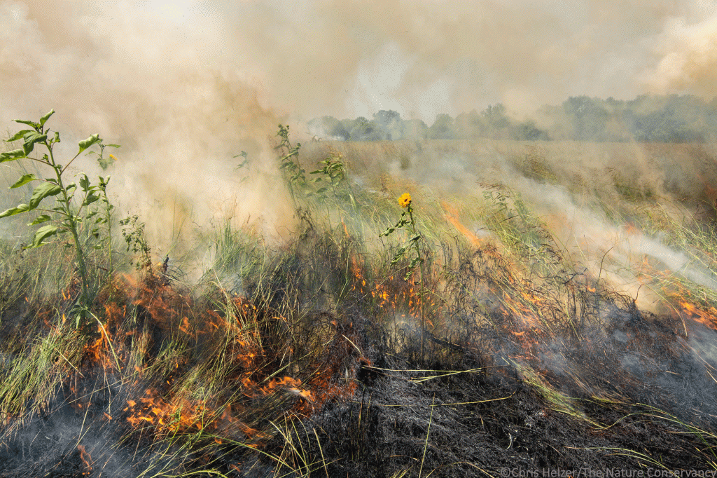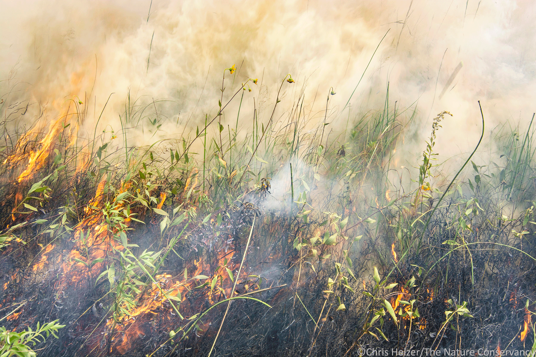 Flames make their way through stiff sunflower, goldenrod, and other prairie plants.