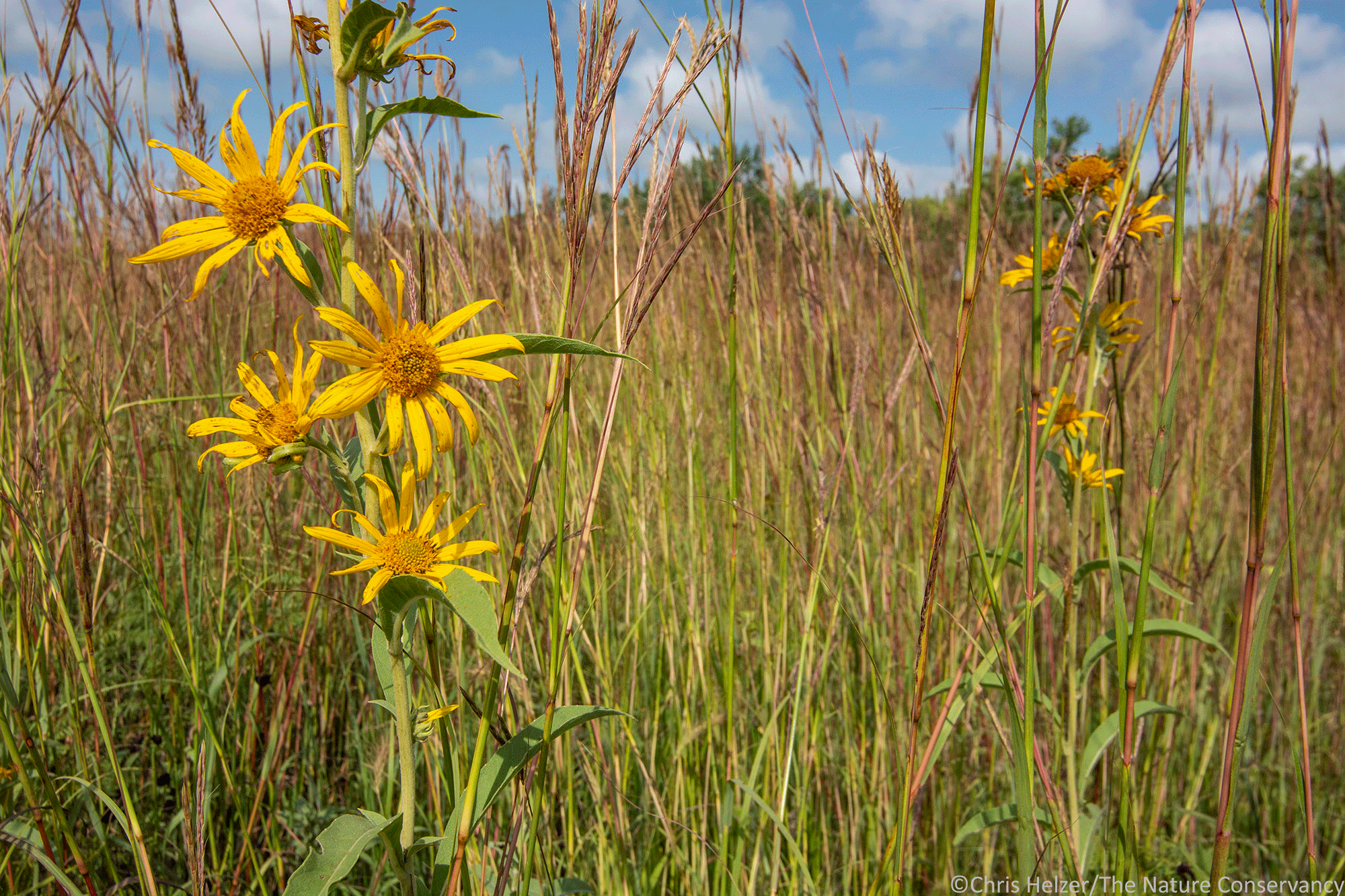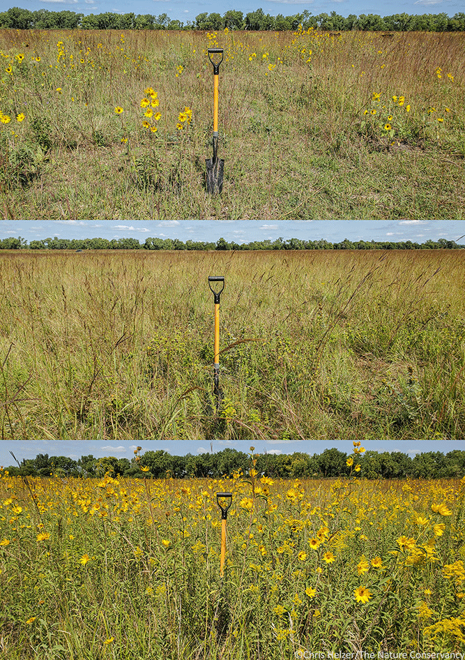 The creation and enhancement of plant diversity adds complexity to the habitat structure by through the architectural variety among plant species. A diverse plant community also helps ensure abundant food and other resources for pollinators, herbivores, predators, and other role players in the prairie. Even more importantly, it fosters ecological resilience, which will help keep all the ecological communities viable through droughts, floods, disease outbreaks, and other stresses. In return, a shifting mosaic of heterogeneous habitat supports diverse plant communities by making sure each plant gets a chance to thrive now and then, regardless of what kind of competitive environment it needs.