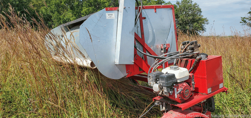 This week, though, while I did some hand harvesting, much of my time was spent running a pull-behind mechanical harvester (seed stripper). I wrote about the particular machine we have several years ago, if you’re interested. We (meaning Nelson Winkel) have made a few minor modifications to it over time and it’s a great way to harvest large amounts of some species. The mechanical approach works best when there are big congregations of plants and an absence of invasive species we need to avoid. This week, I was using the seed stripper to harvest big grasses (big bluestem, Indiangrass, switchgrass, etc.), perennial sunflowers (stiff, Maximilian, and sawtooth), and a mixture of big summer wildflowers (Illinois bundleflower, wild bergamot, showy tick trefoil, and others).