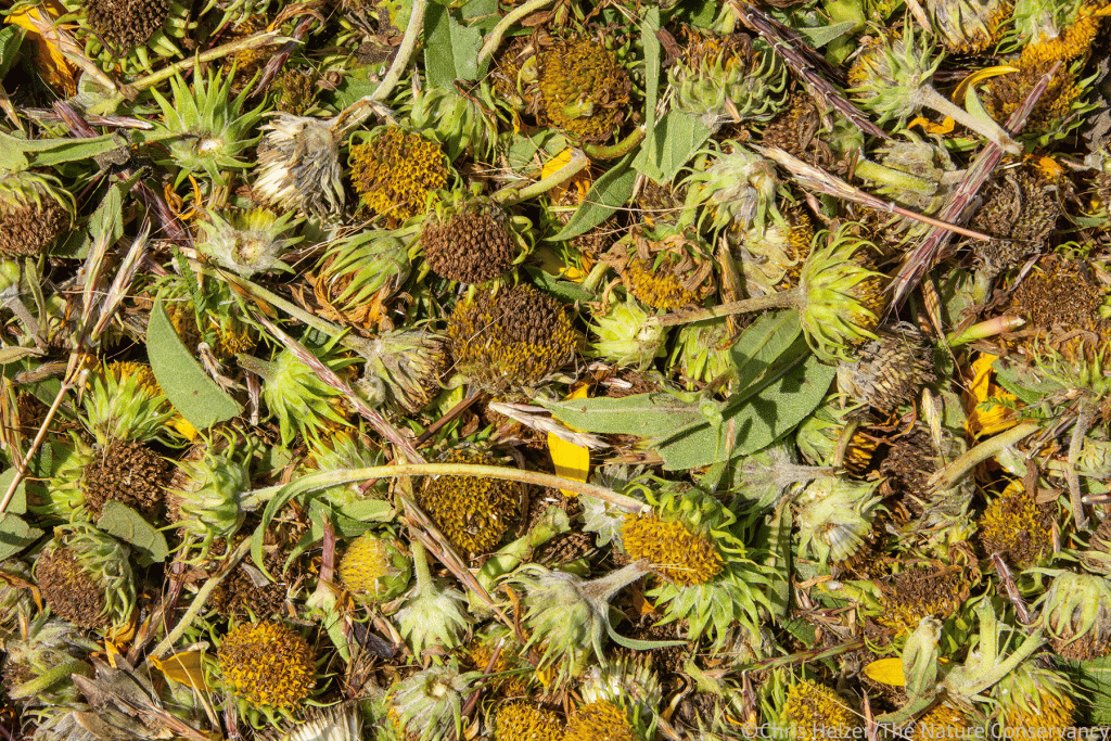 A close up of Maximilian and sawtooth sunflower heads harvested this week with a pull-behind seed stripper.