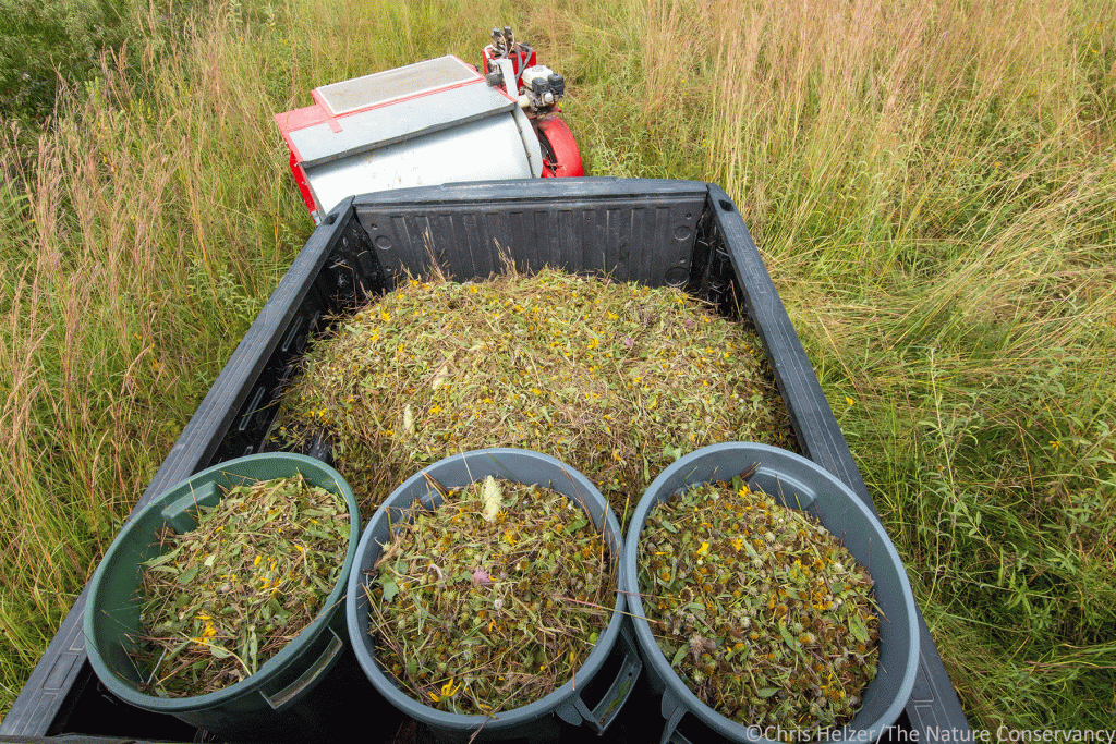 Most of those species are harvested by hand, which might seem inefficient if you’ve not been part of an effort like this. In reality, it’s surprising how much seed you can grab with your hands if you’re organized and diligent. We have a spreadsheet of plant species and constantly update it with the best sites to find large amounts of seed from each plant and when the seed is ripe. We’re constantly scouting for seed while doing other work too, keeping track of good populations we’ll want to return to later. Armed with that information, we strap buckets to our waists, wade into the prairie, and grab big handfuls (hopefully!) from each species.