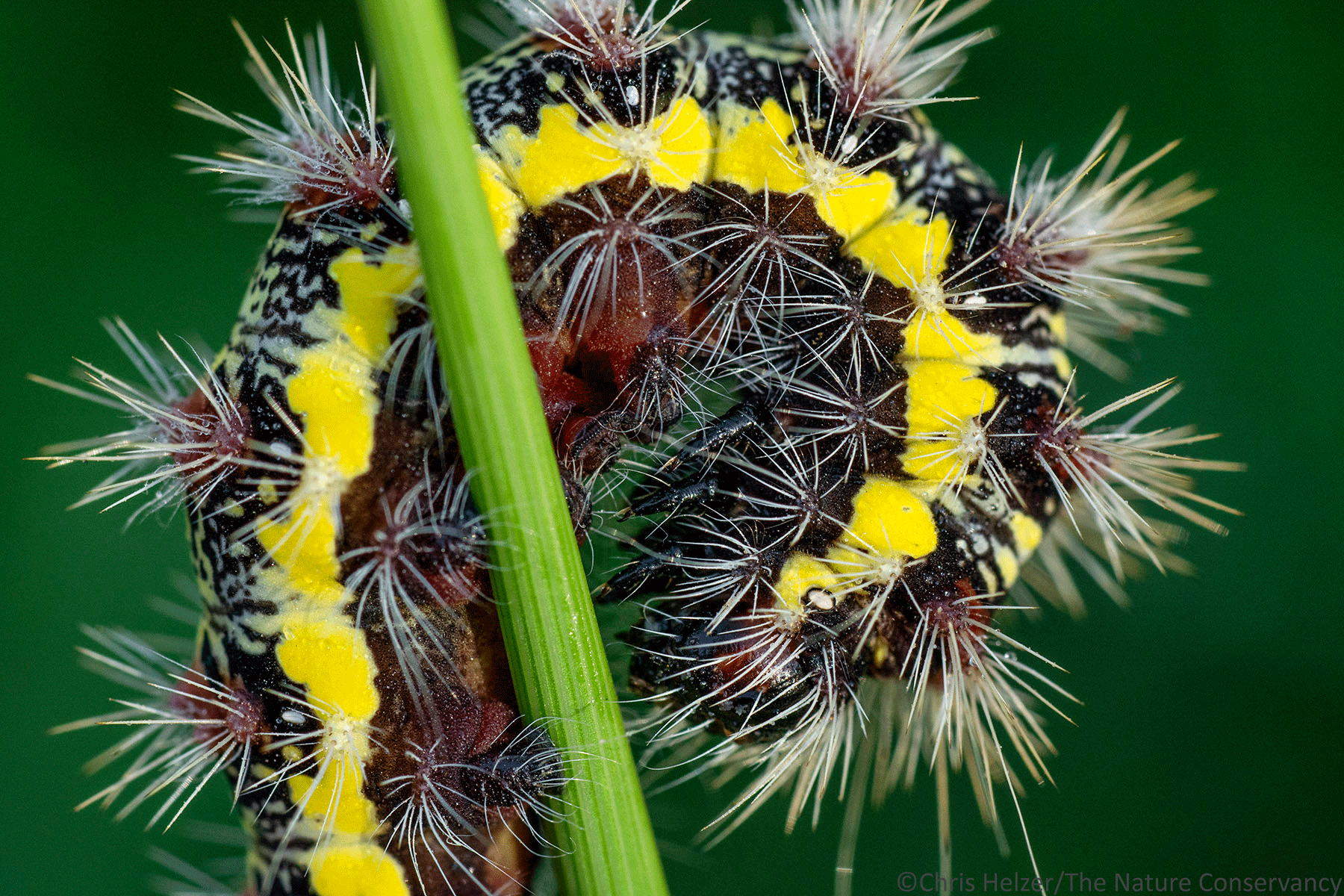 Chris, the caterpillar appears to be the Smeared dagger moth (Acronicta oblinita). The literature says it feeds on forbs and a number of woody species. No mention of graminoids. If you observed it actually feeding, that would be worth reporting. But I suspect it was “wandering” when you observed it on rice cutgrass.